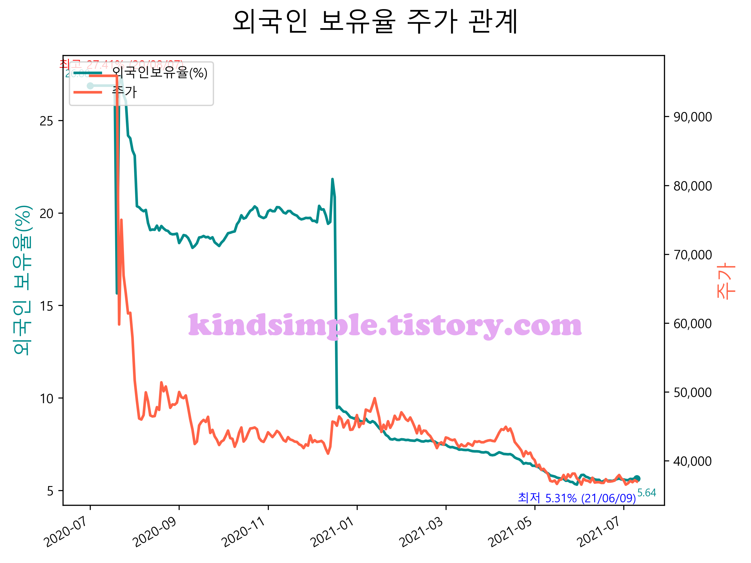 최근 1년간 외국인 보유율 및 주가와의 관계입니다.