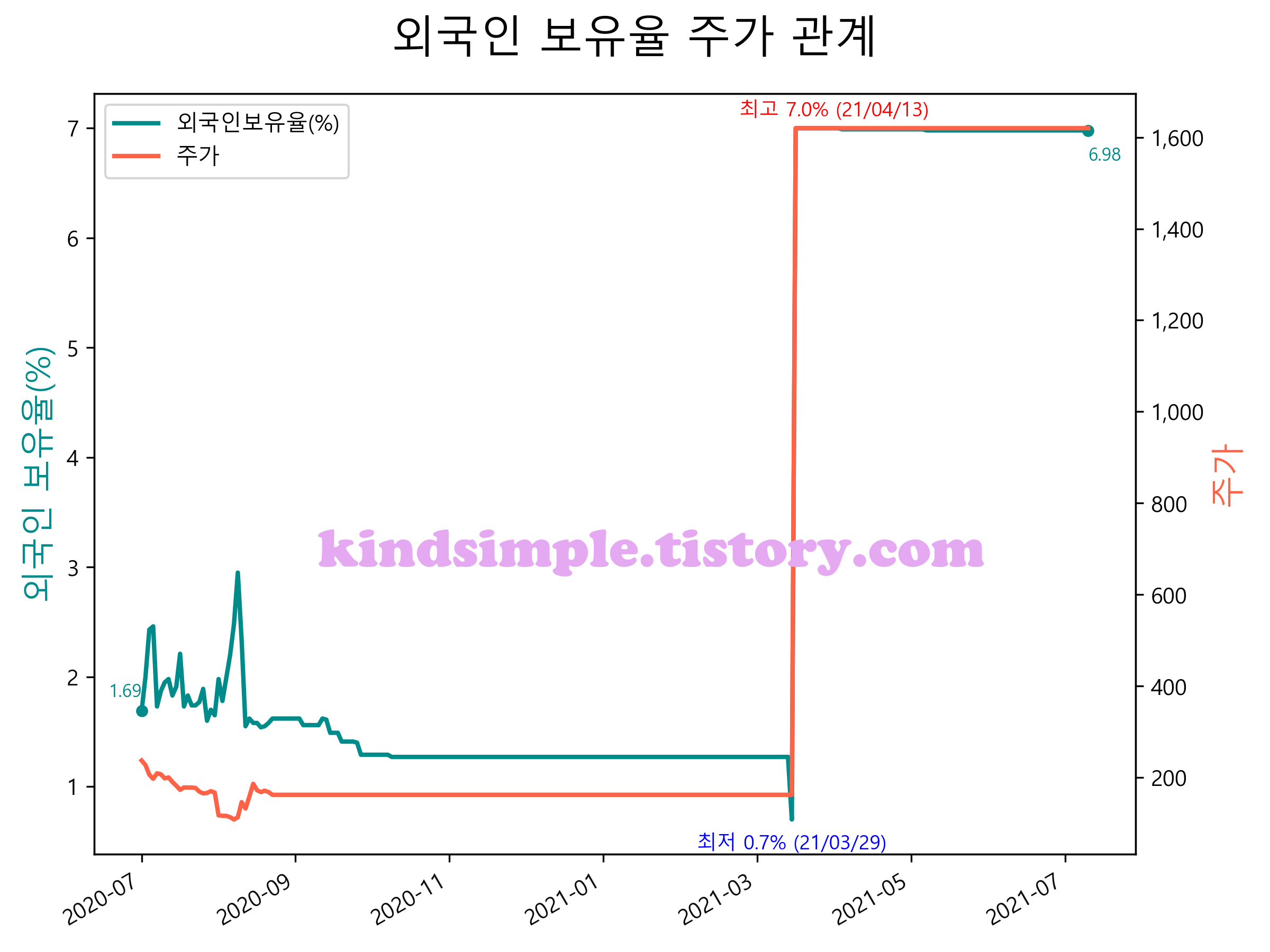 최근 1년간 외국인 보유율 및 주가와의 관계입니다.