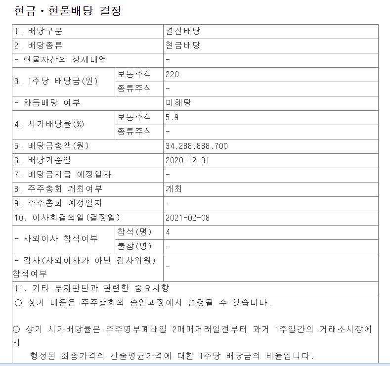 2020년 배당금은 220원 입니다. 작년 배당금인 230원보다 -4.3% 감소했습니다.