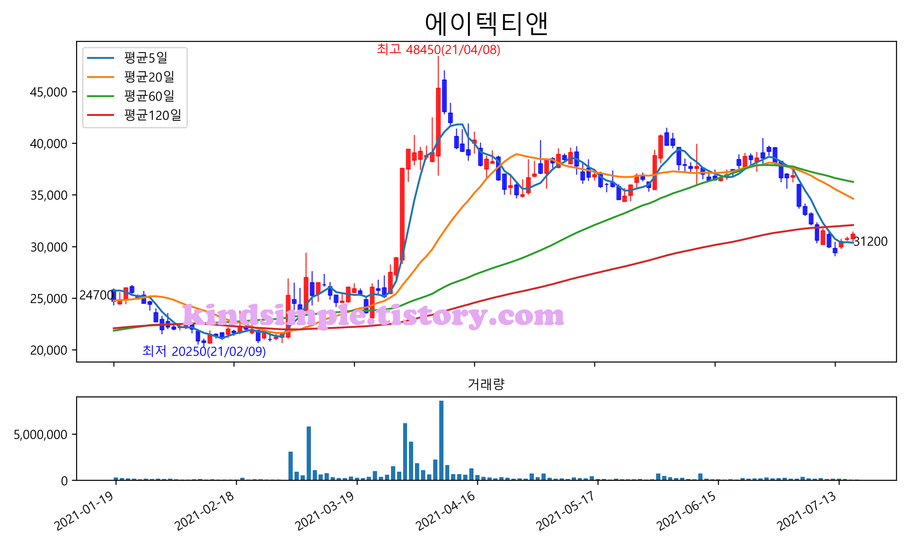 최근 6개월간 캔들차트 및 이동평균선입니다.