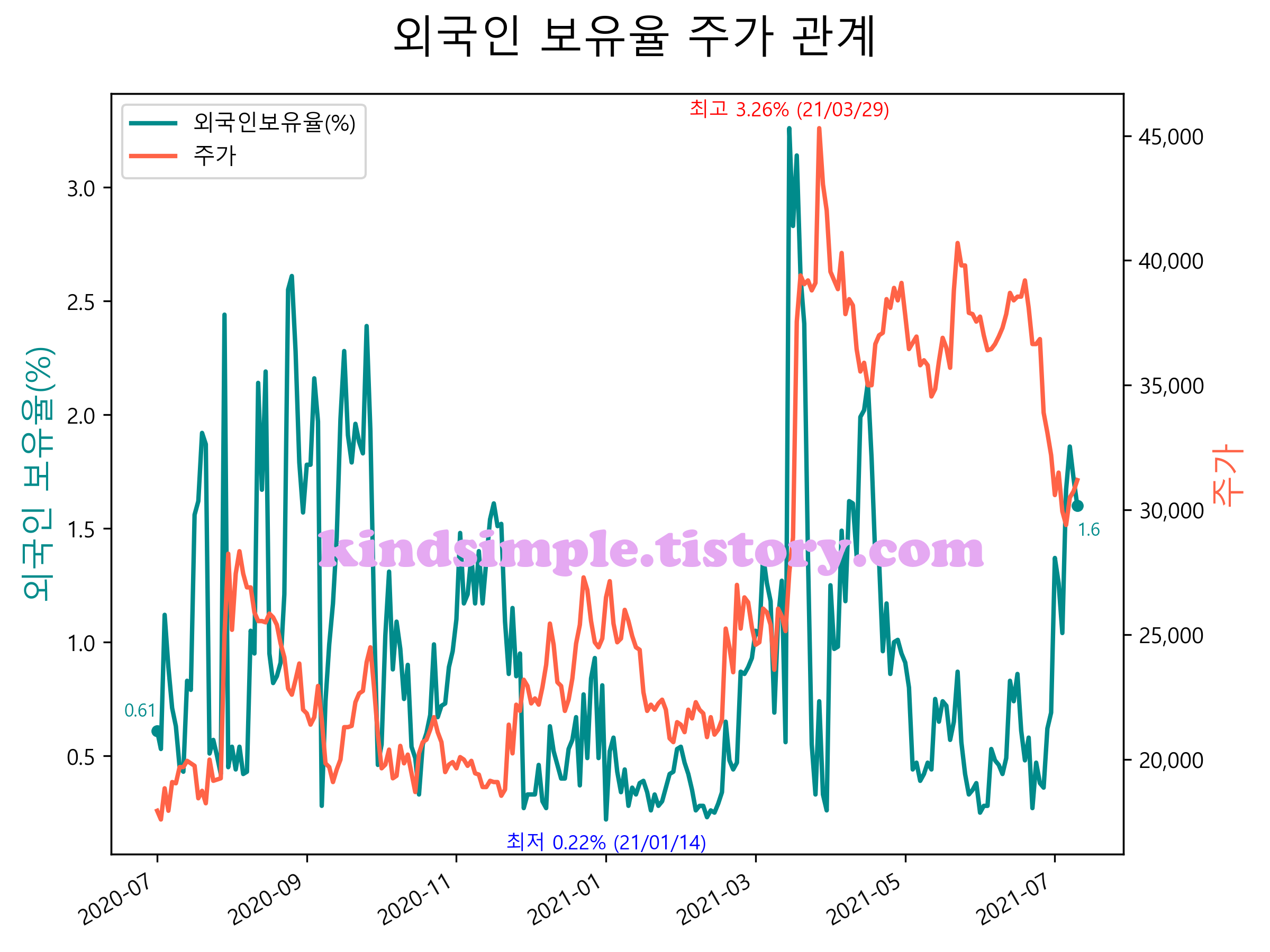 최근 1년간 외국인 보유율 및 주가와의 관계입니다.
