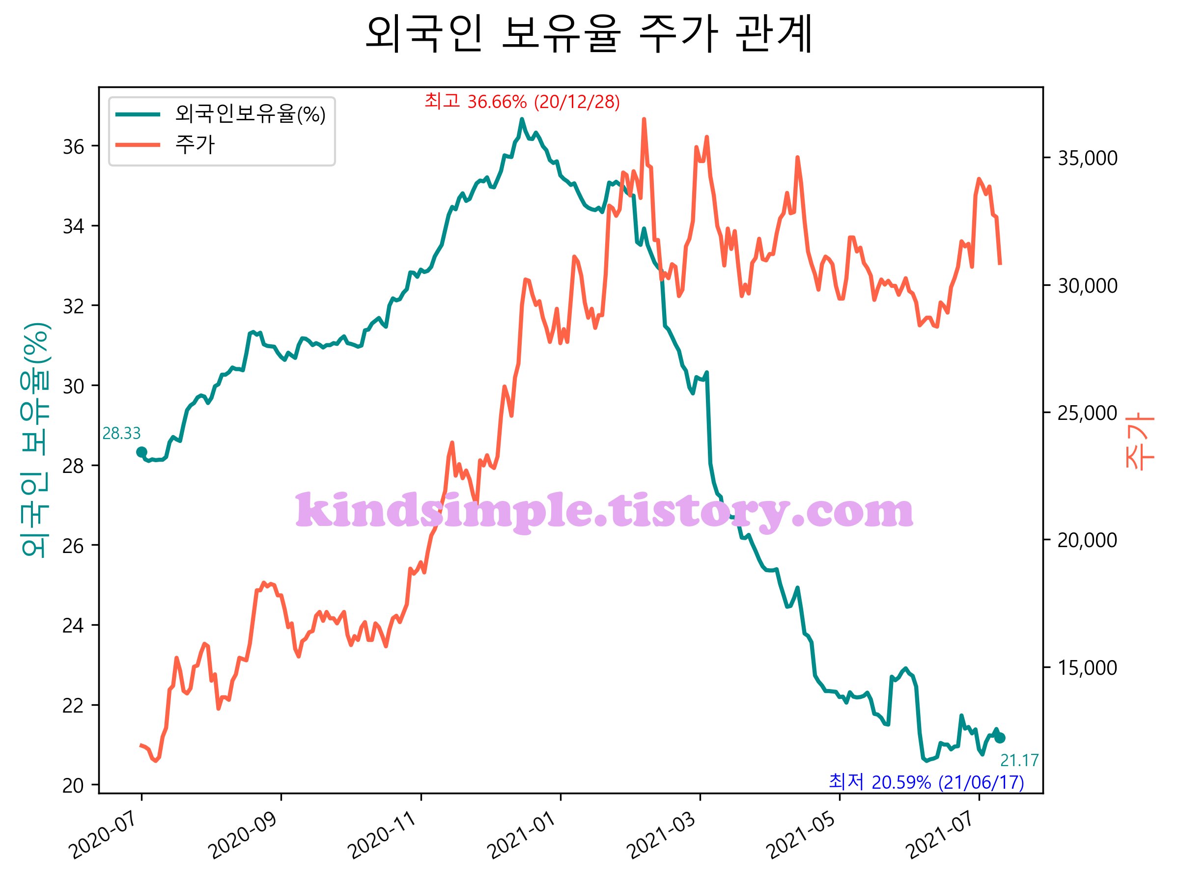 최근 1년간 외국인 보유율 및 주가와의 관계입니다.