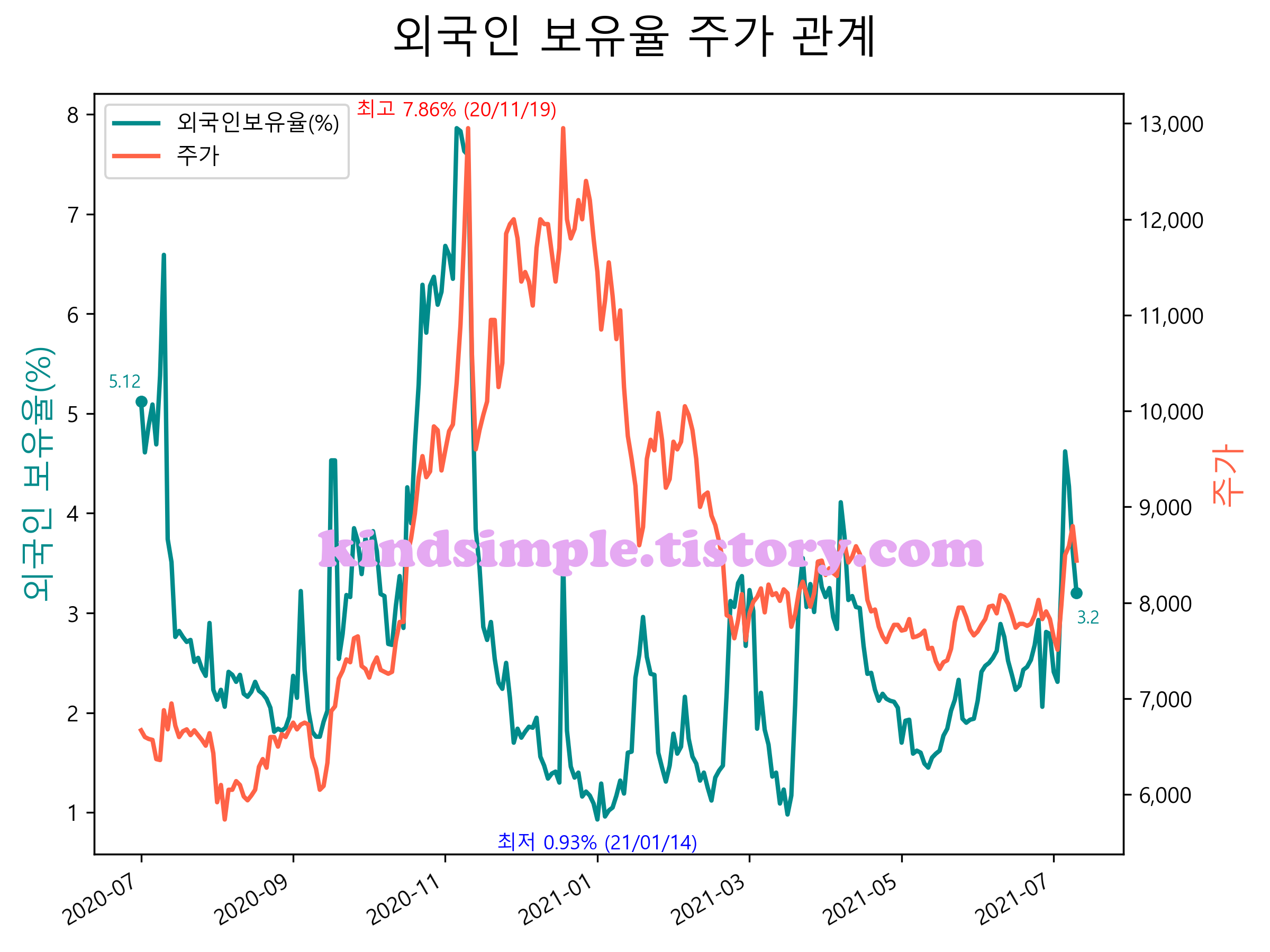최근 1년간 외국인 보유율 및 주가와의 관계입니다.