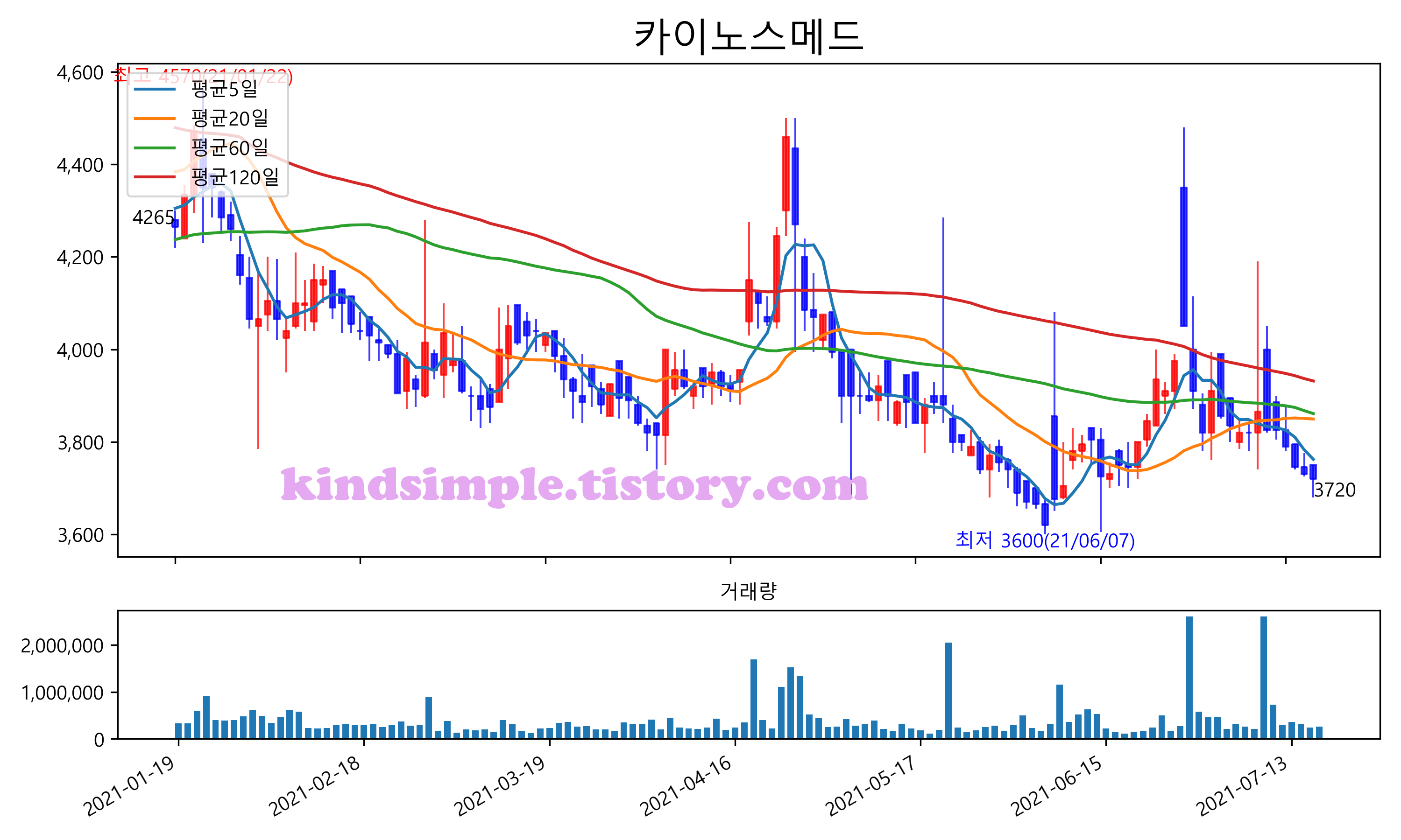 최근 6개월간 캔들차트 및 이동평균선입니다.