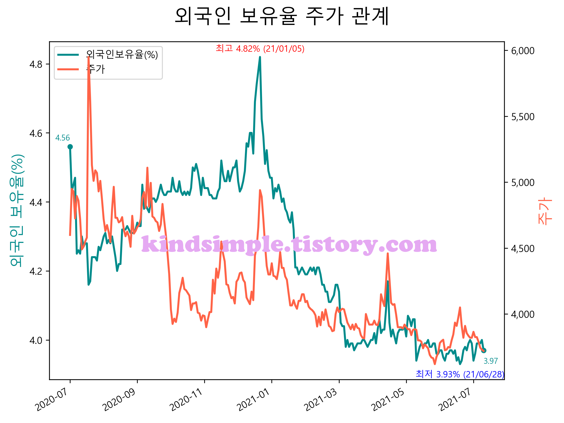 최근 1년간 외국인 보유율 및 주가와의 관계입니다.