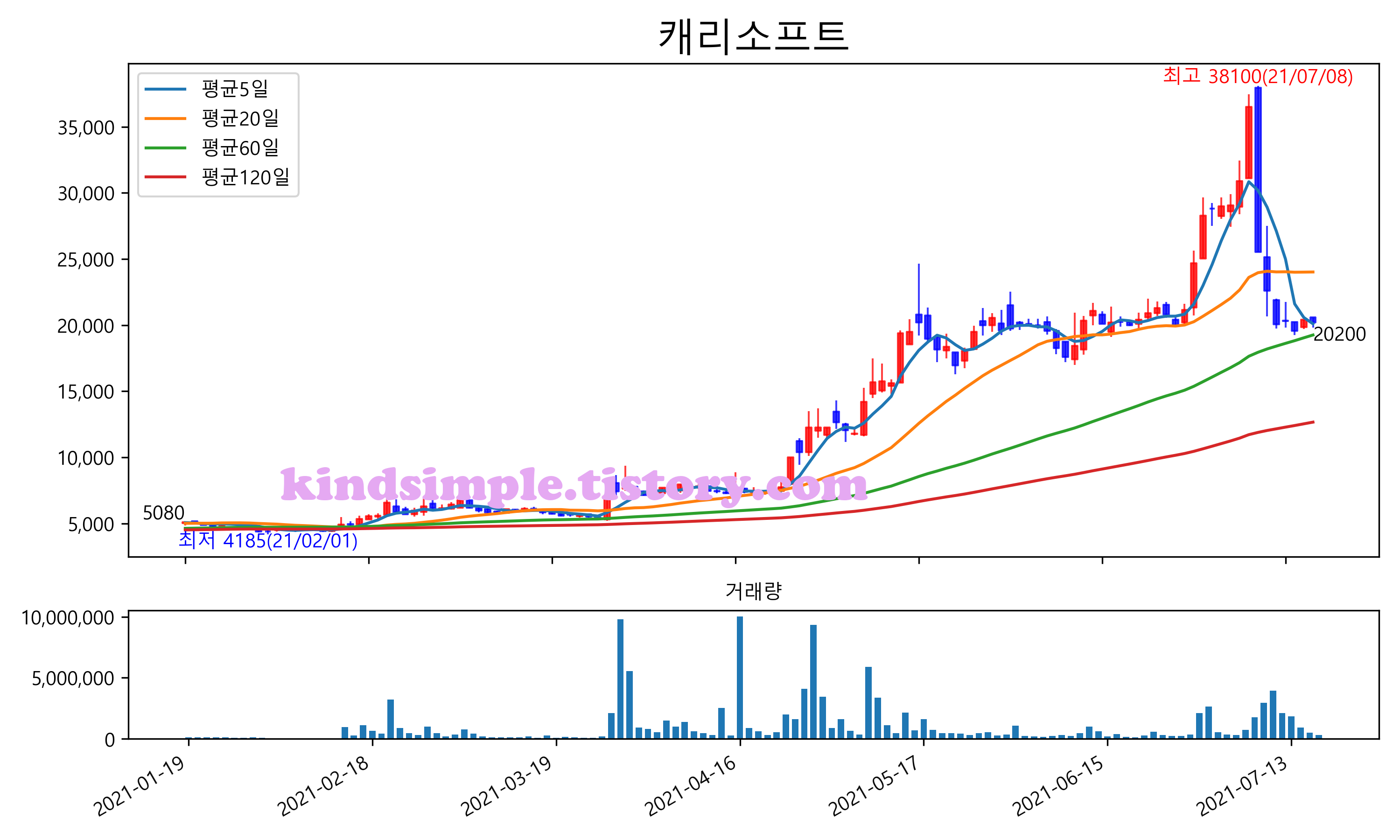 최근 6개월간 캔들차트 및 이동평균선입니다.
