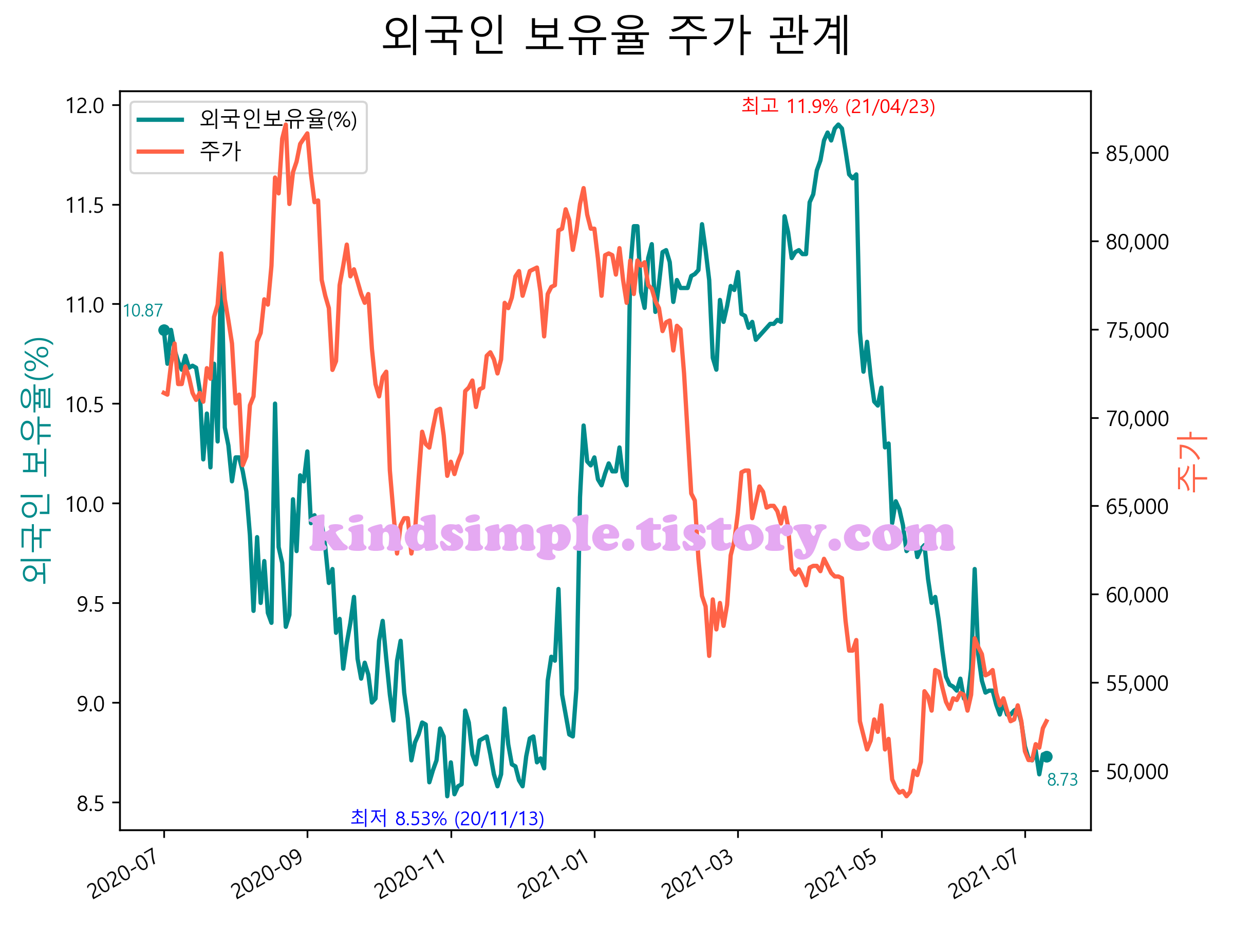 최근 1년간 외국인 보유율 및 주가와의 관계입니다.