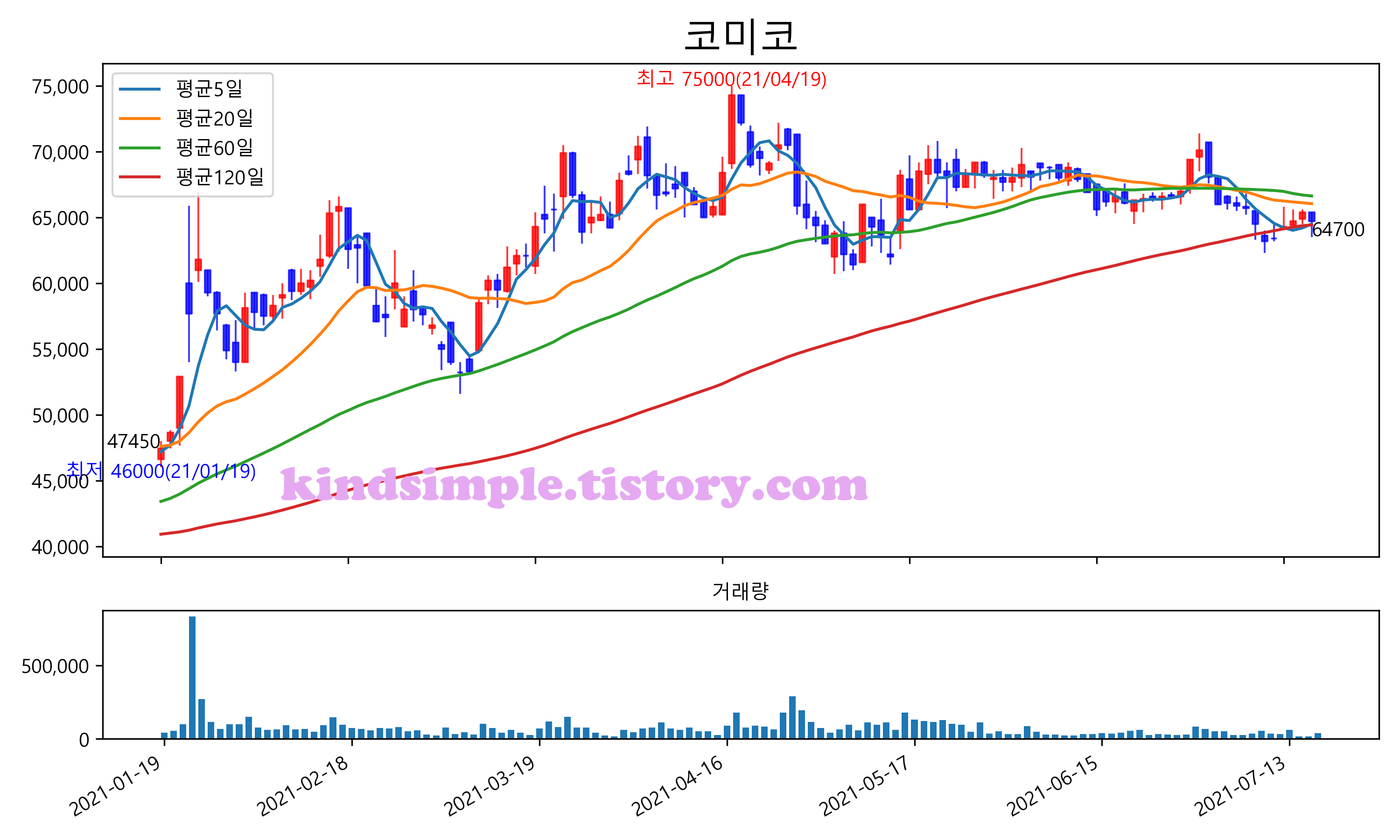 최근 6개월간 캔들차트 및 이동평균선입니다.