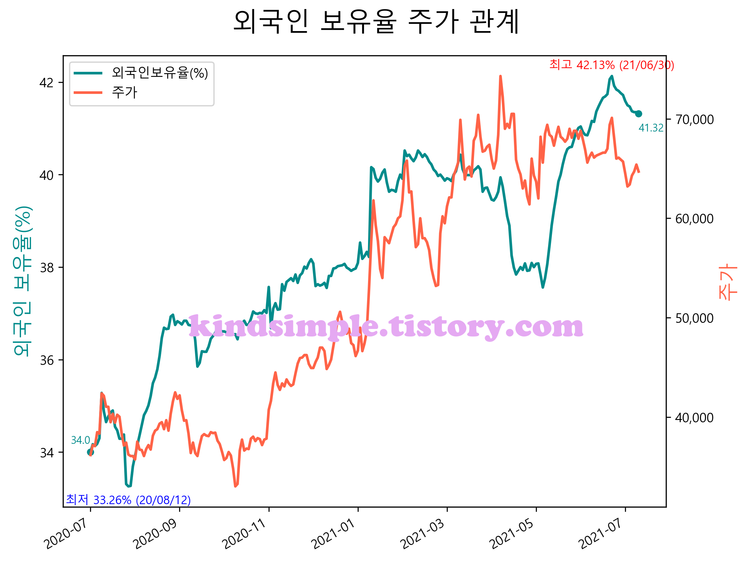 최근 1년간 외국인 보유율 및 주가와의 관계입니다.