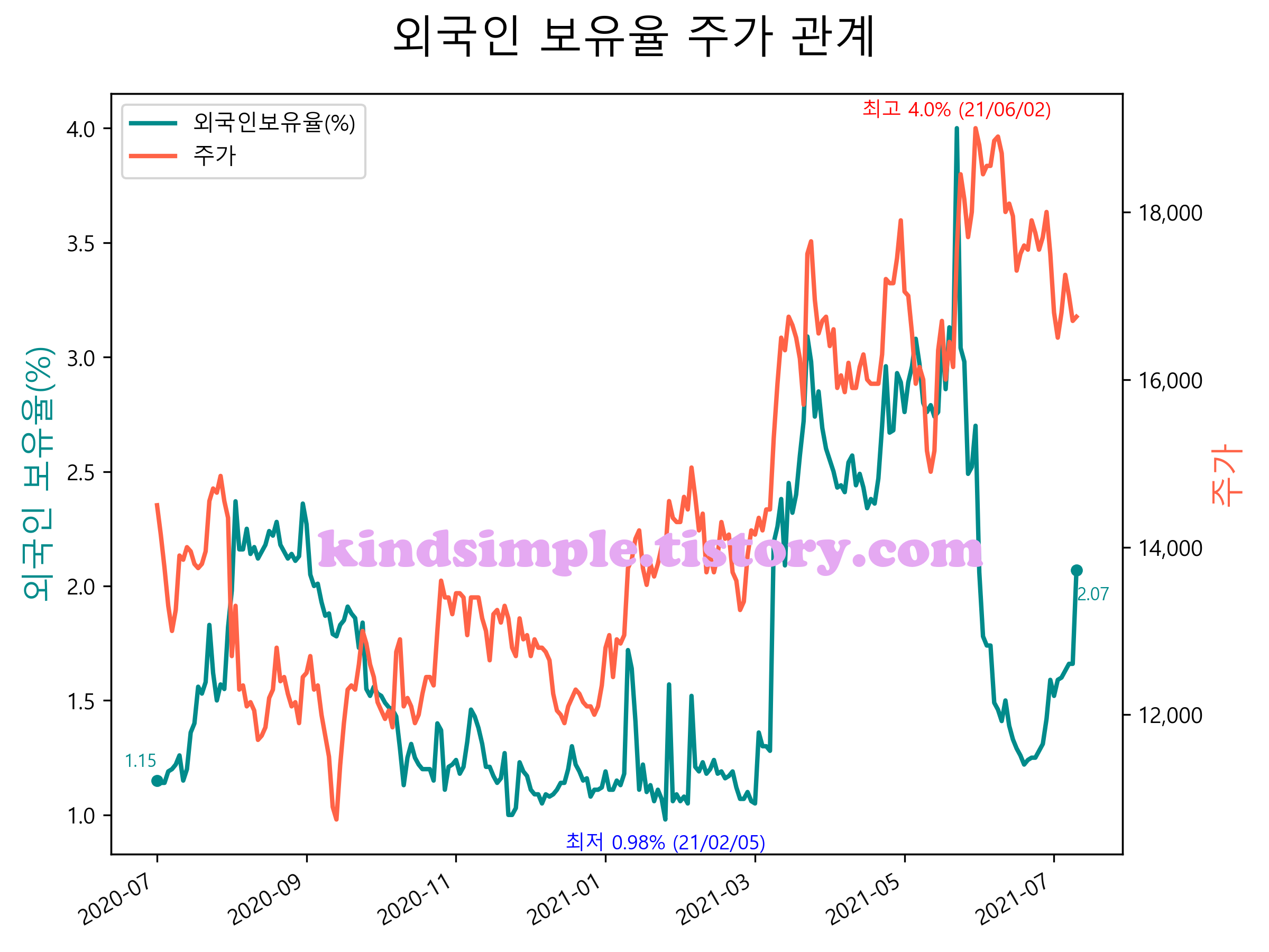 최근 1년간 외국인 보유율 및 주가와의 관계입니다.