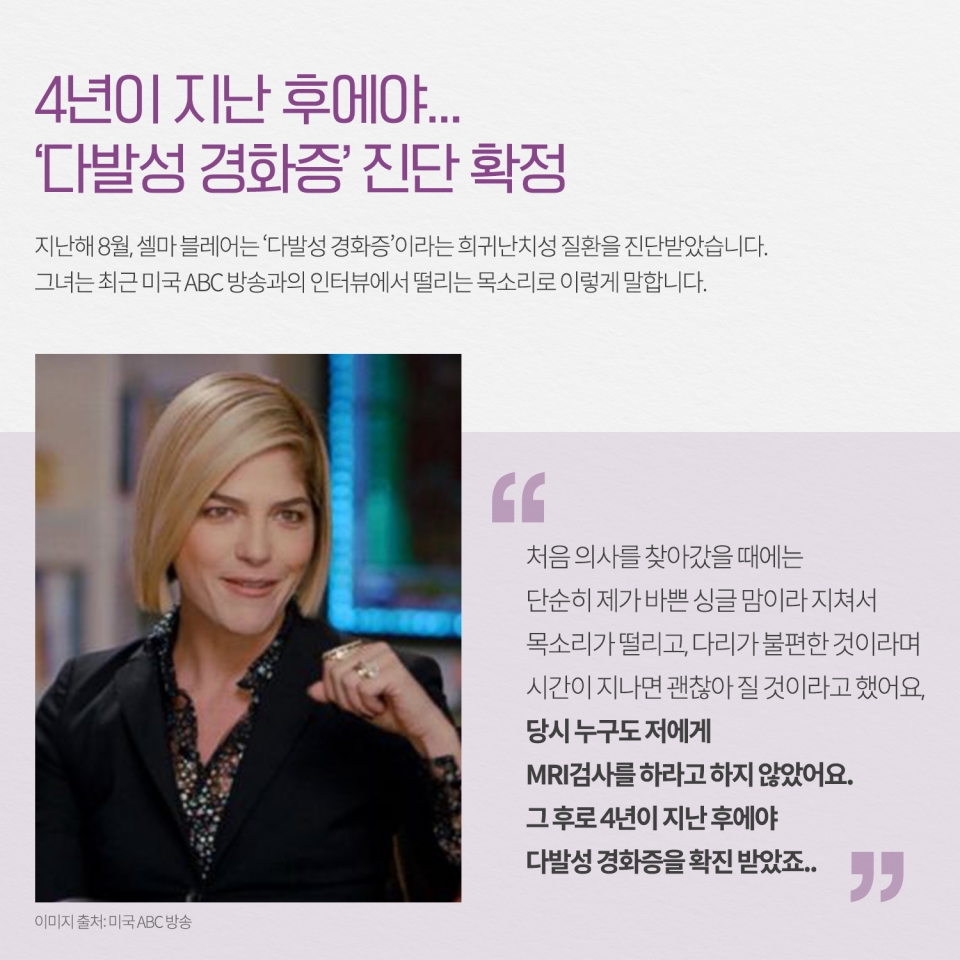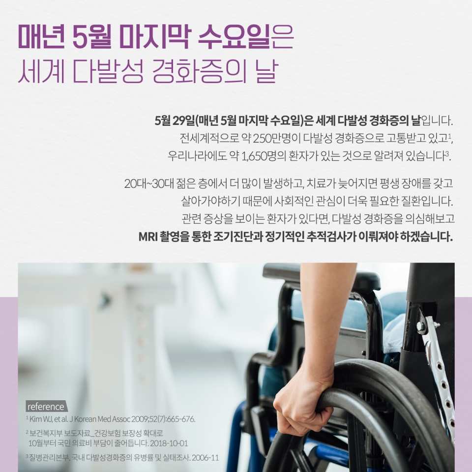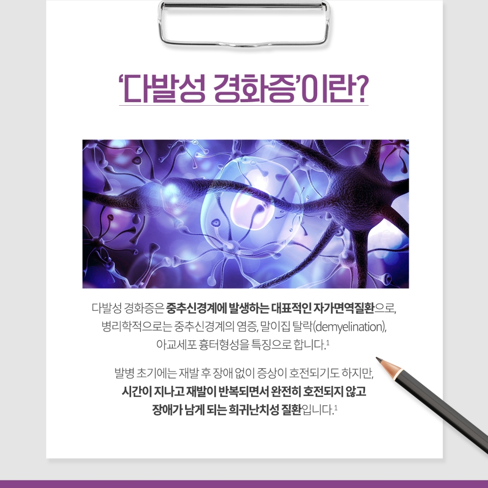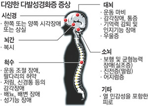 다발성경화증(multiple sclerosis)은 20~30대에 자주 발생하며, 여자에게 흔한 병으로 뇌, 척수, 시신경으로 구성된 중추신경계에서 발생하는 만성 질환으로 환자 자신의 면역 체계가 건강한 세포와 조직을 공격하는 자가면역 질환입니다. 신경통증과 마비로 고통받는 병으로 전세계적으로 약 250만명이 다발성 경화증으로 고통받고 있습니다. 다발성 경화증의 증상은 어떻게 될까요?