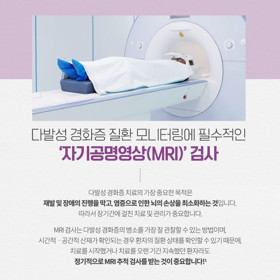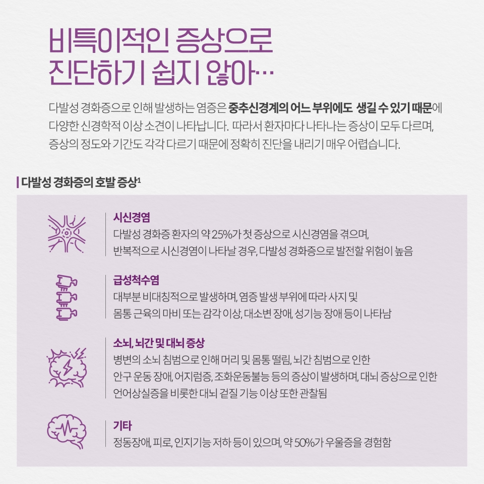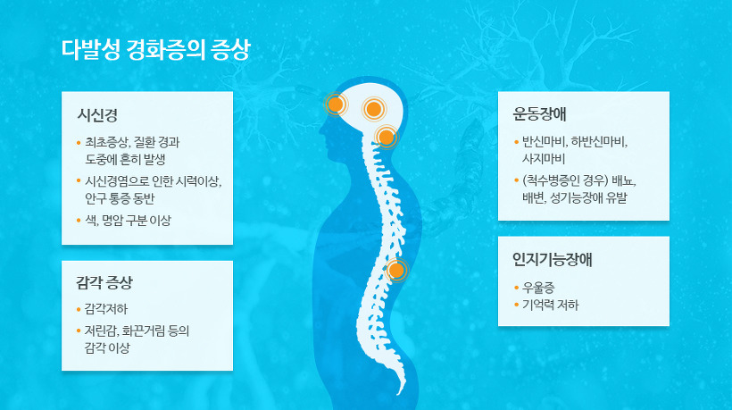 다발성 경화증은 재발이 반복되고 병적인 변화가 중추신경계의 여러 곳에 산재되어 나타나는 특징이 있습니다. 즉, 다발성 경화증에 특이적인 증상이 따로 있는 것이 아니며, 위치에 따라 질환의 증상 및 징후가 다양하게 나타납니다. 다발성 경화증의 대표적인 증상으로는 감각증상과 운동장애입니다.