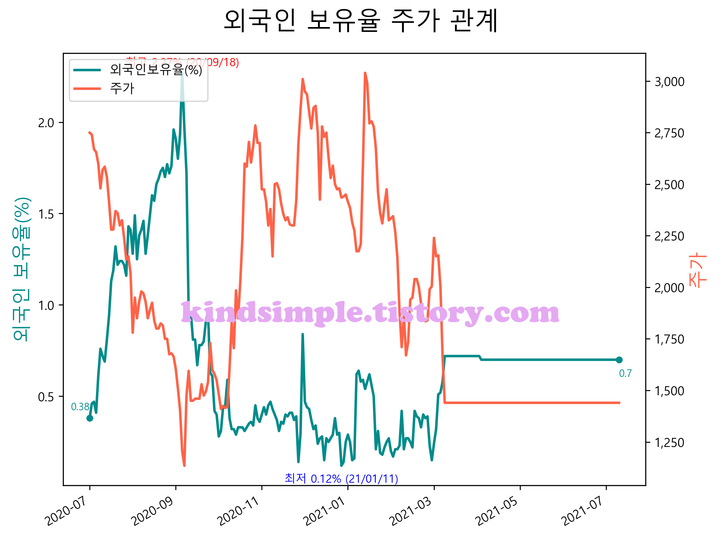 최근 1년간 외국인 보유율 및 주가와의 관계입니다.