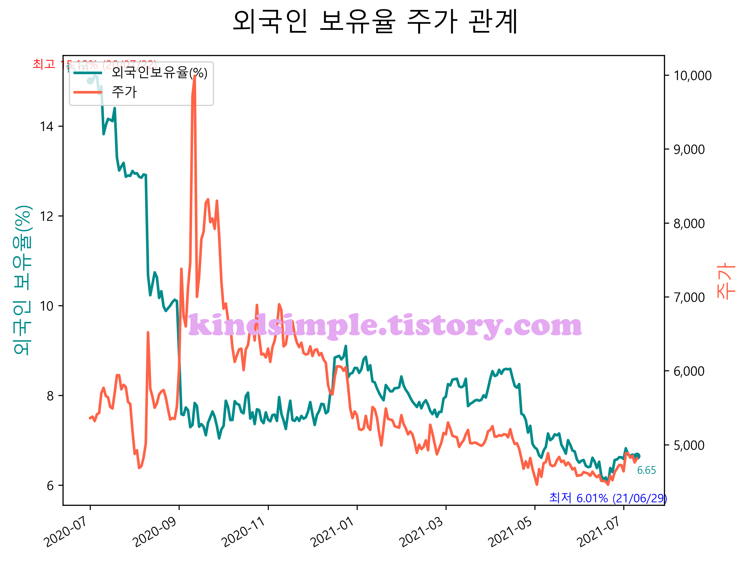 최근 1년간 외국인 보유율 및 주가와의 관계입니다.