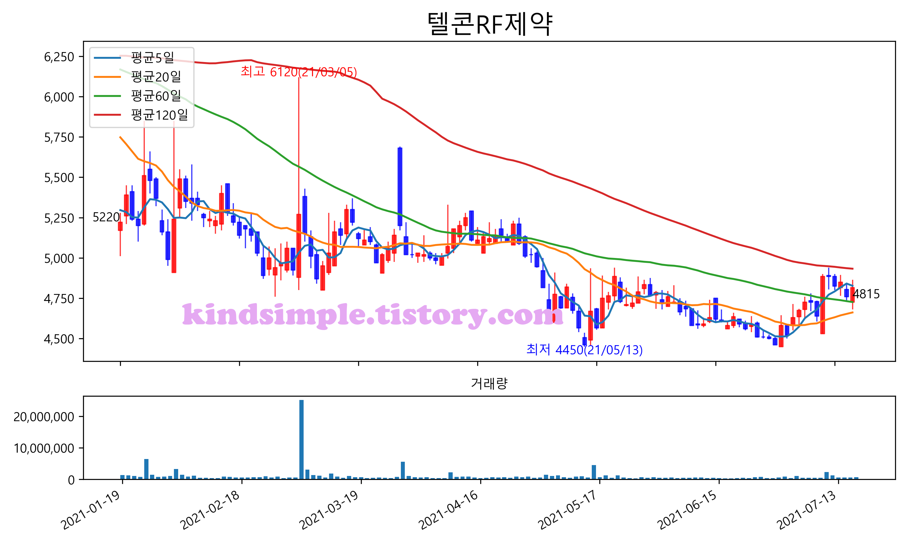 최근 6개월간 캔들차트 및 이동평균선입니다.
