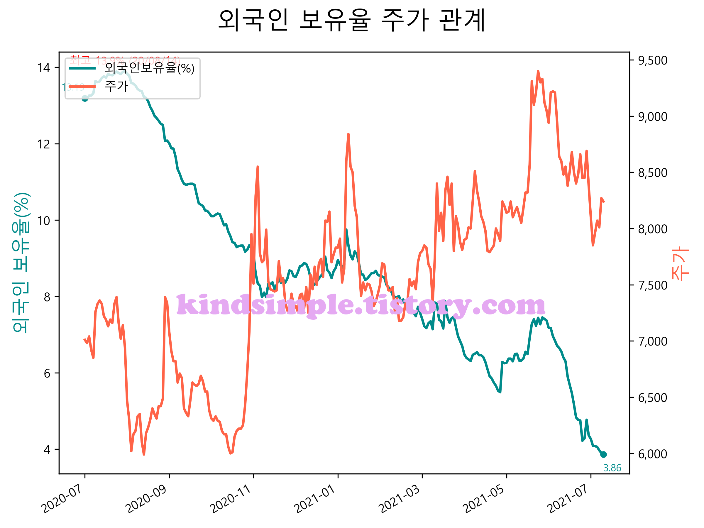 최근 1년간 외국인 보유율 및 주가와의 관계입니다.