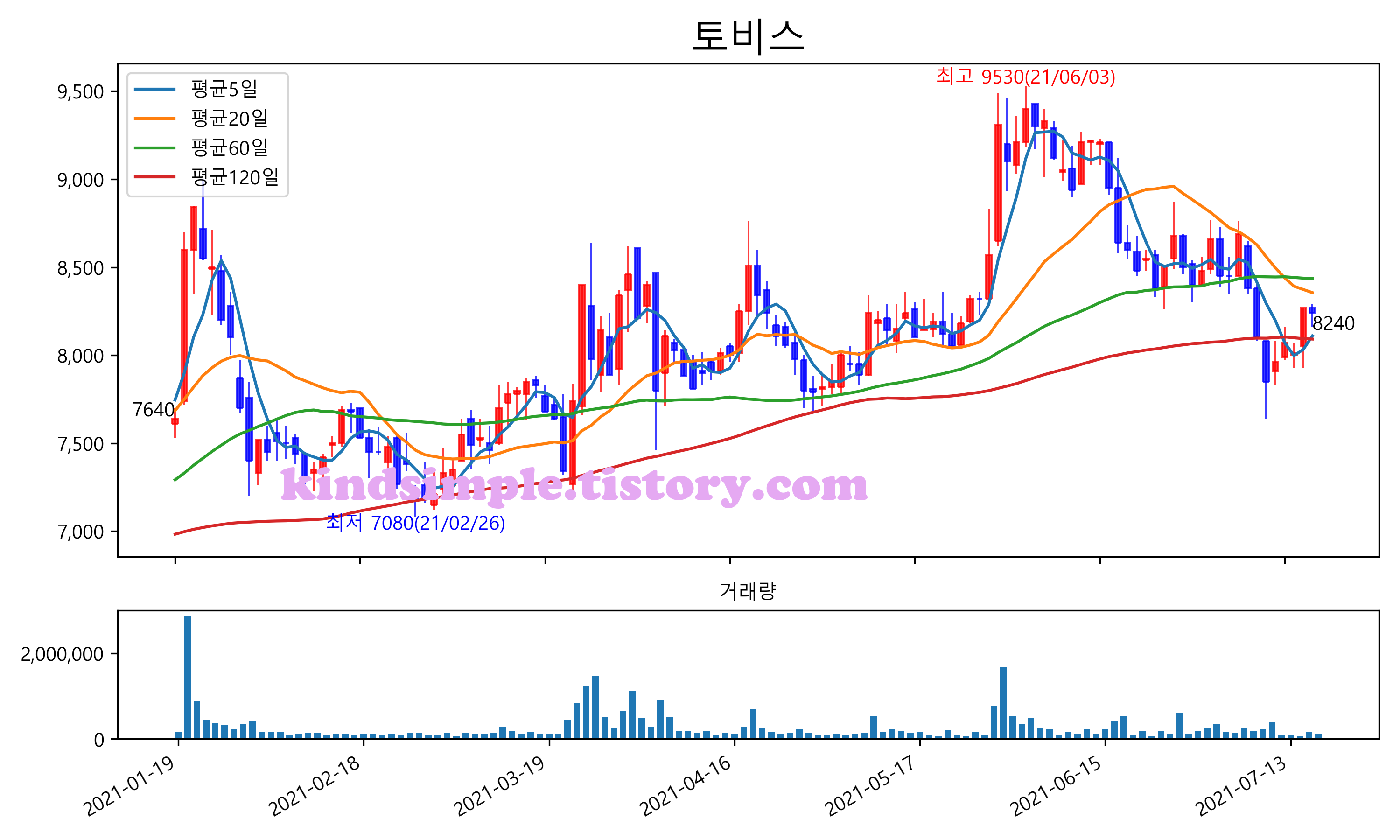 최근 6개월간 캔들차트 및 이동평균선입니다.