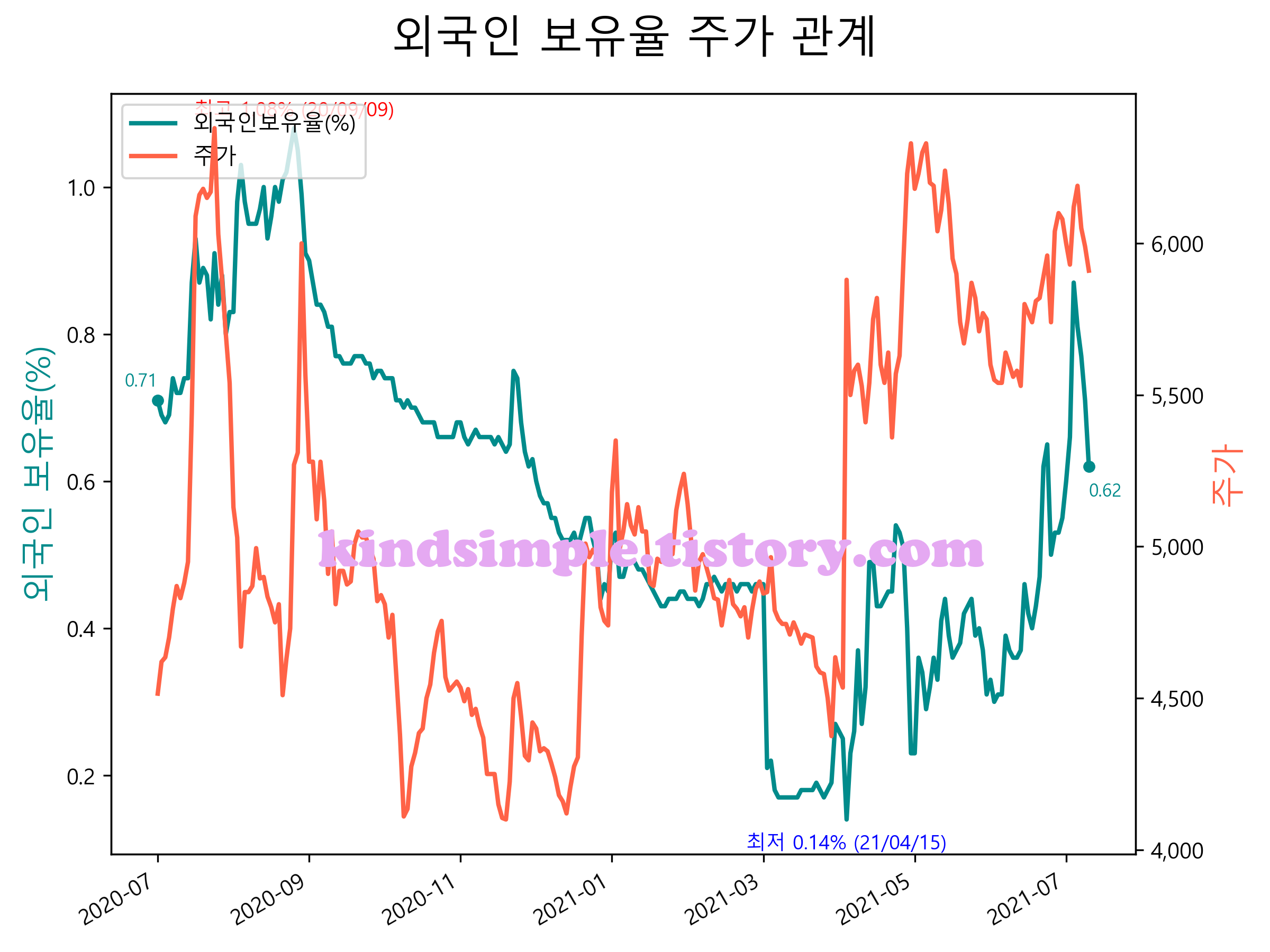 최근 1년간 외국인 보유율 및 주가와의 관계입니다.