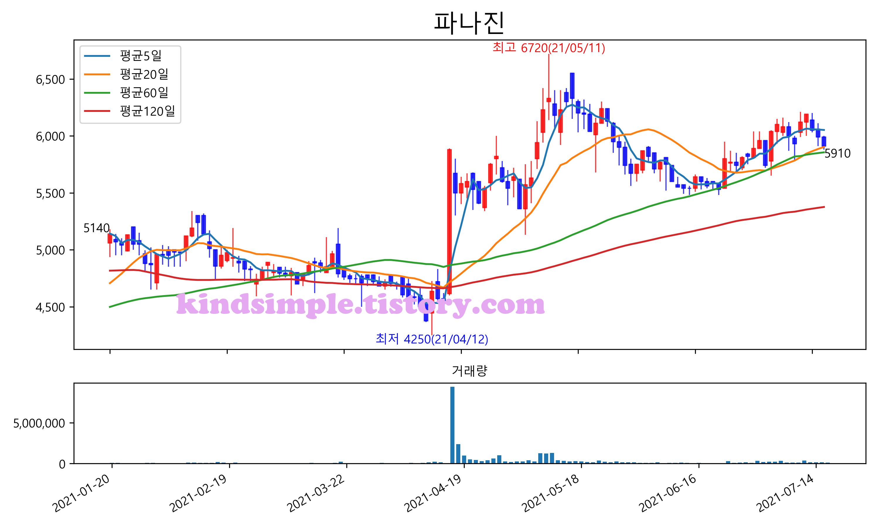 최근 6개월간 캔들차트 및 이동평균선입니다.