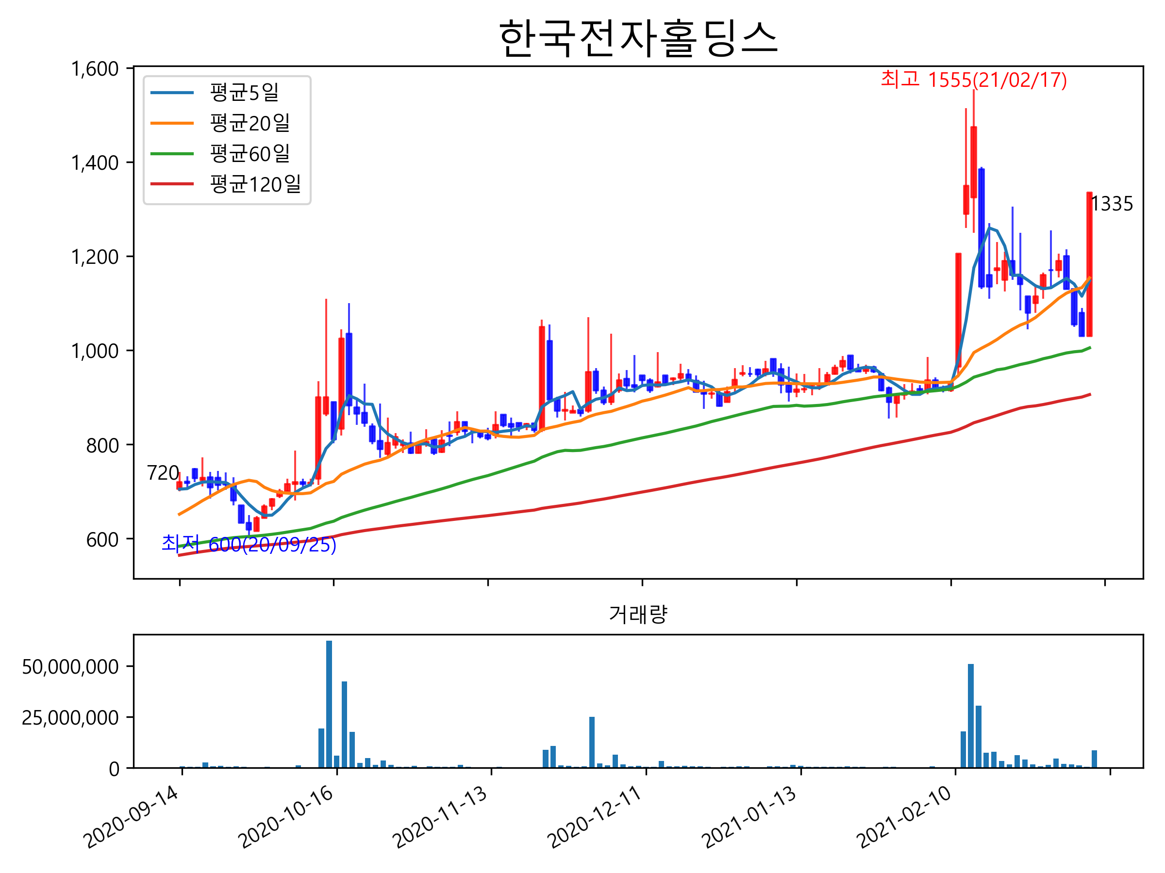 한국전자홀딩스는 쿠팡 물류센터 공사업체로 알려져있습니다. 쿠팡은 미국 증시에 상장하게 되는데 상장 후 조달 자금을 물류 투자에 집중한다는 관측이 나오면서 수혜기대감이 커진 것으로 보여집니다.