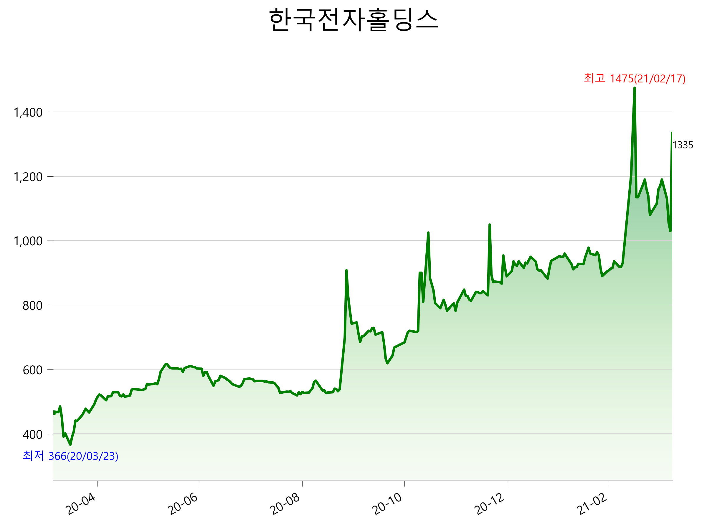 52주 최고가는 1,475원(2021-02-17), 52주 최저가는 366원(2020-03-23)으로 52주간 주가 상승률은 184.6% 입니다.