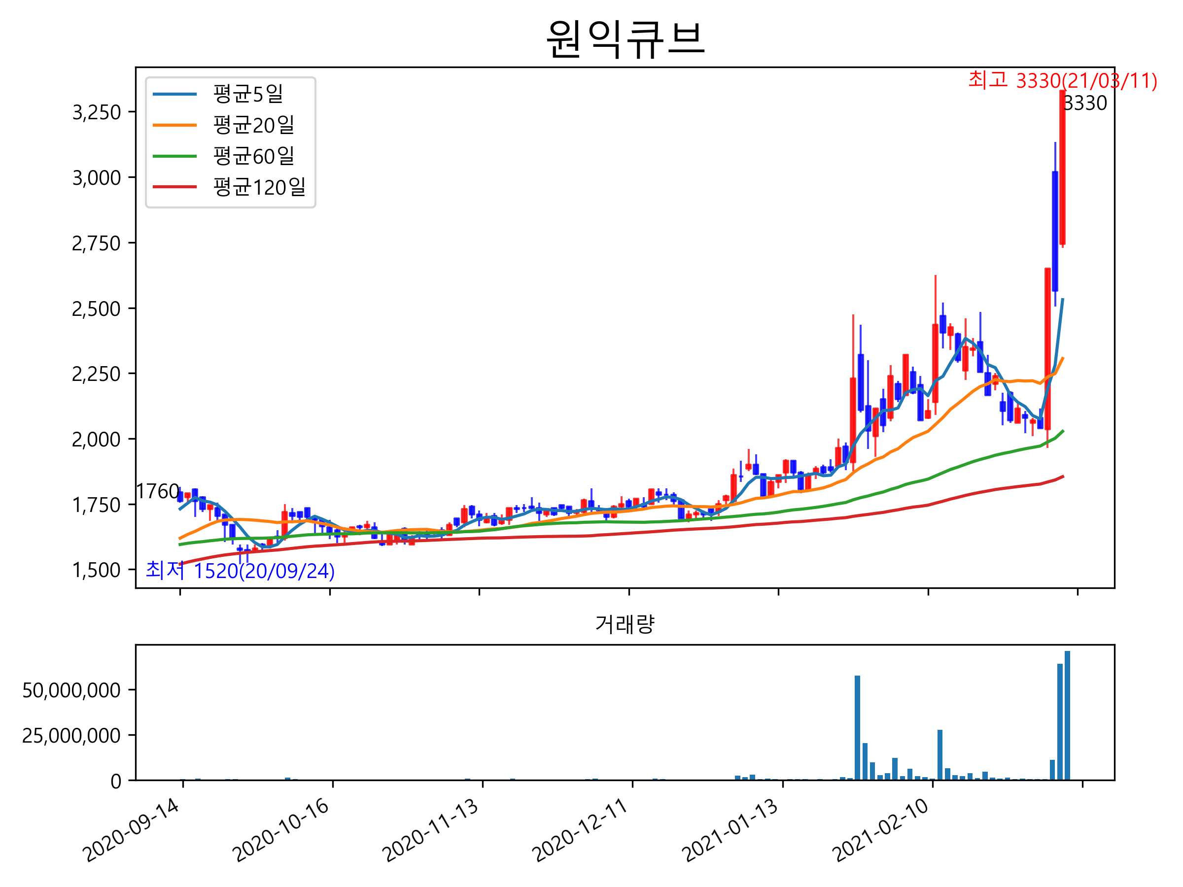 최근 6개월간 캔들차트 및 이동평균선입니다.