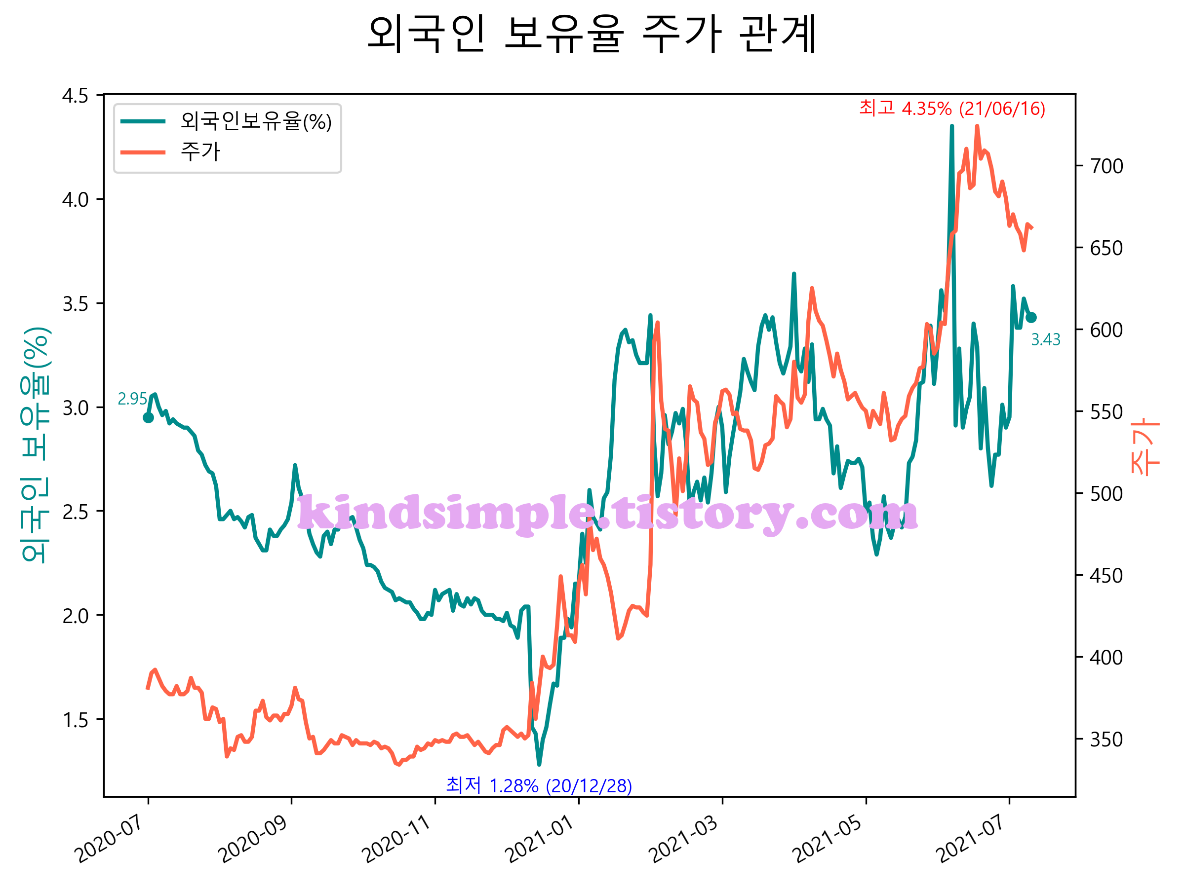 최근 1년간 외국인 보유율 및 주가와의 관계입니다.