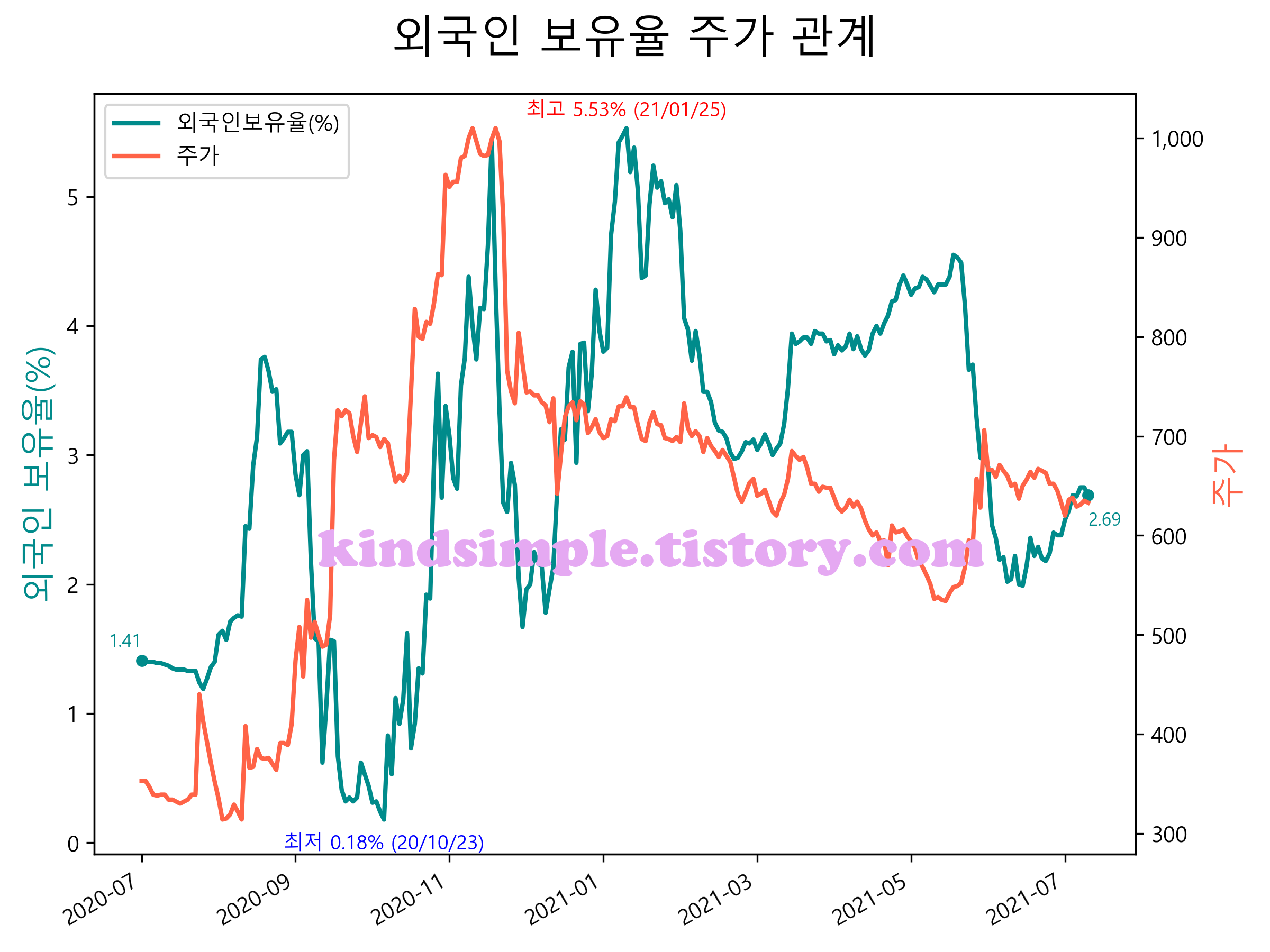 최근 1년간 외국인 보유율 및 주가와의 관계입니다.