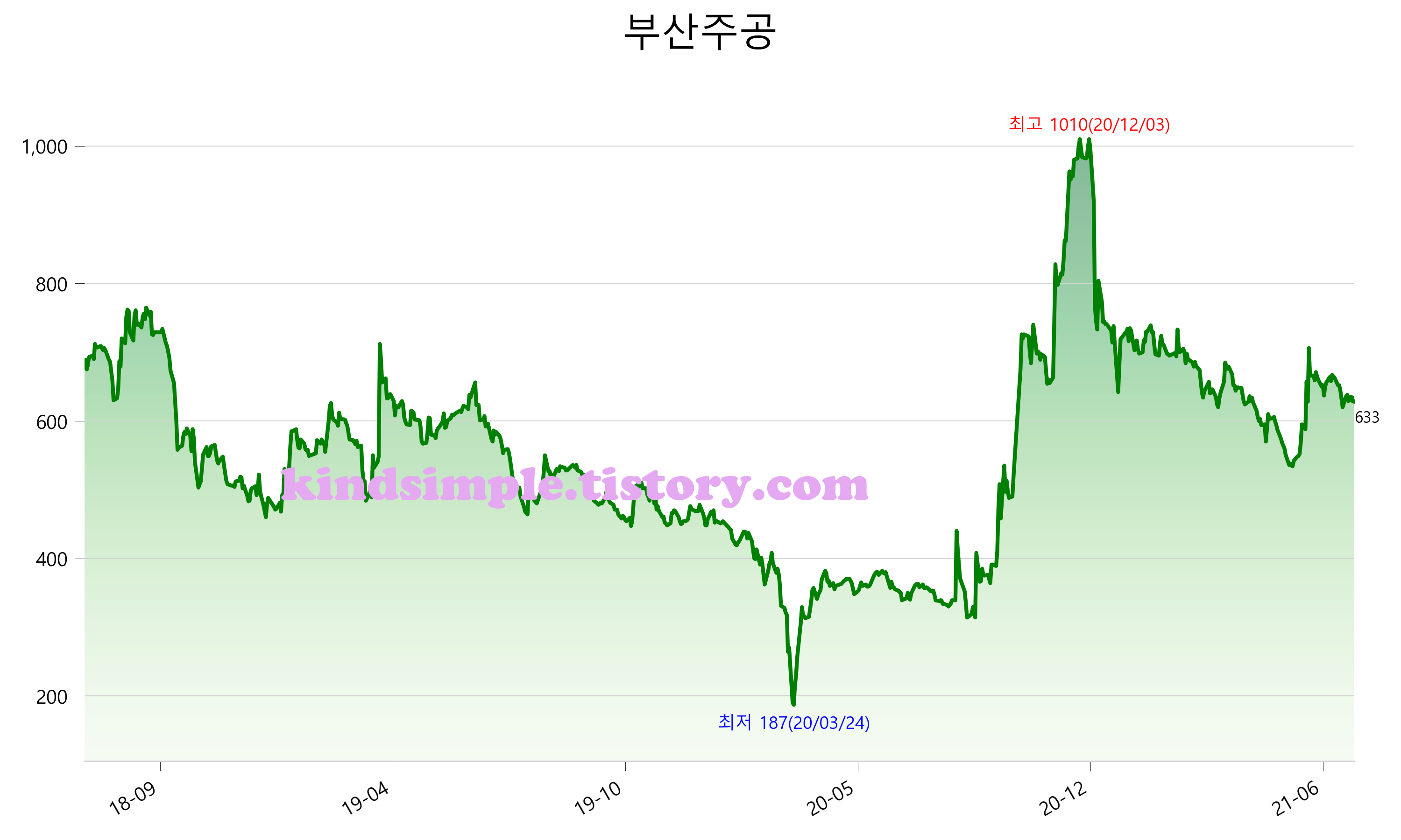 7월 20일 기준 주가는 633원 입니다. 아래는 최근 3년간의 주가흐름입니다.