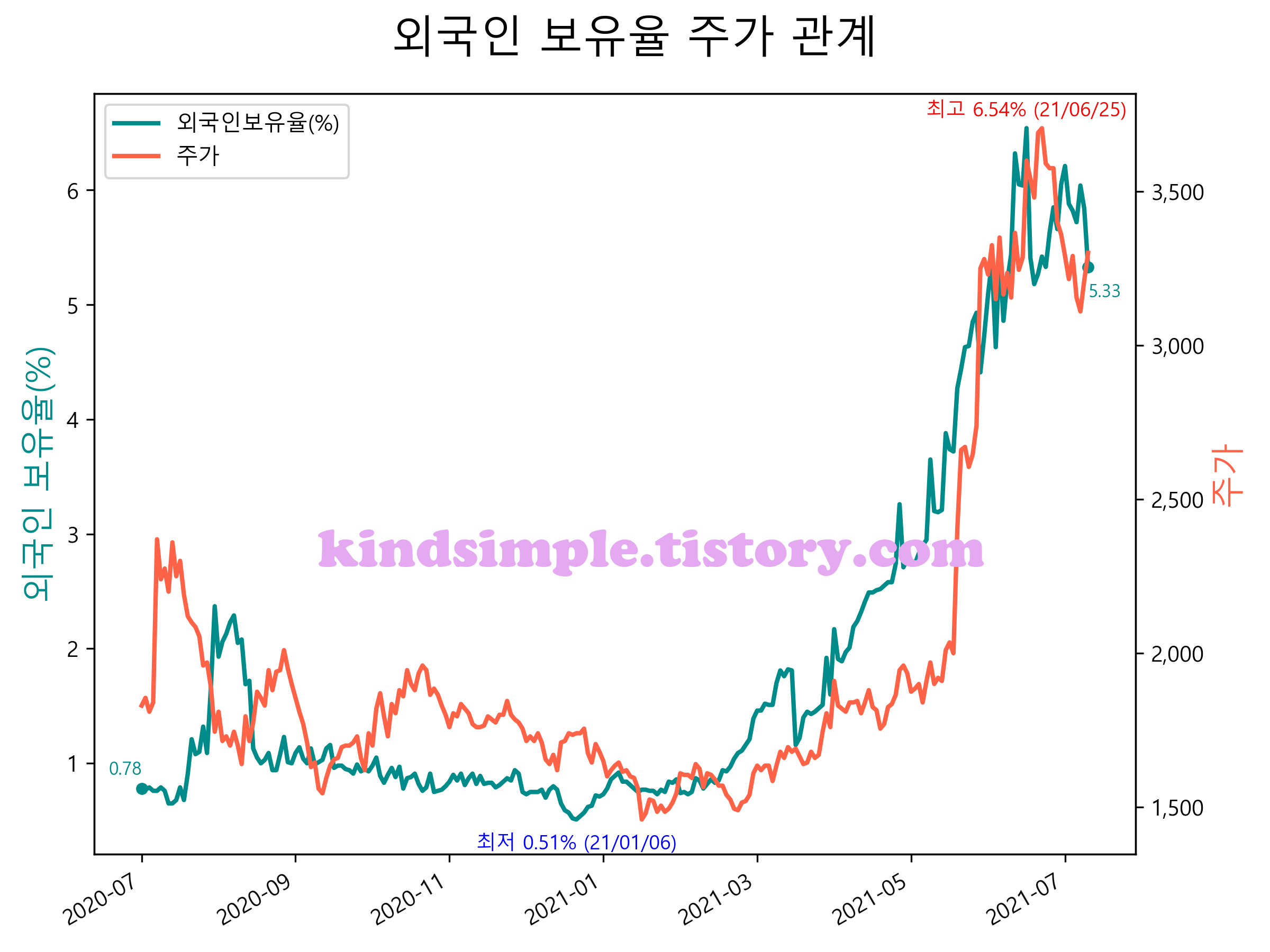 최근 1년간 외국인 보유율 및 주가와의 관계입니다.