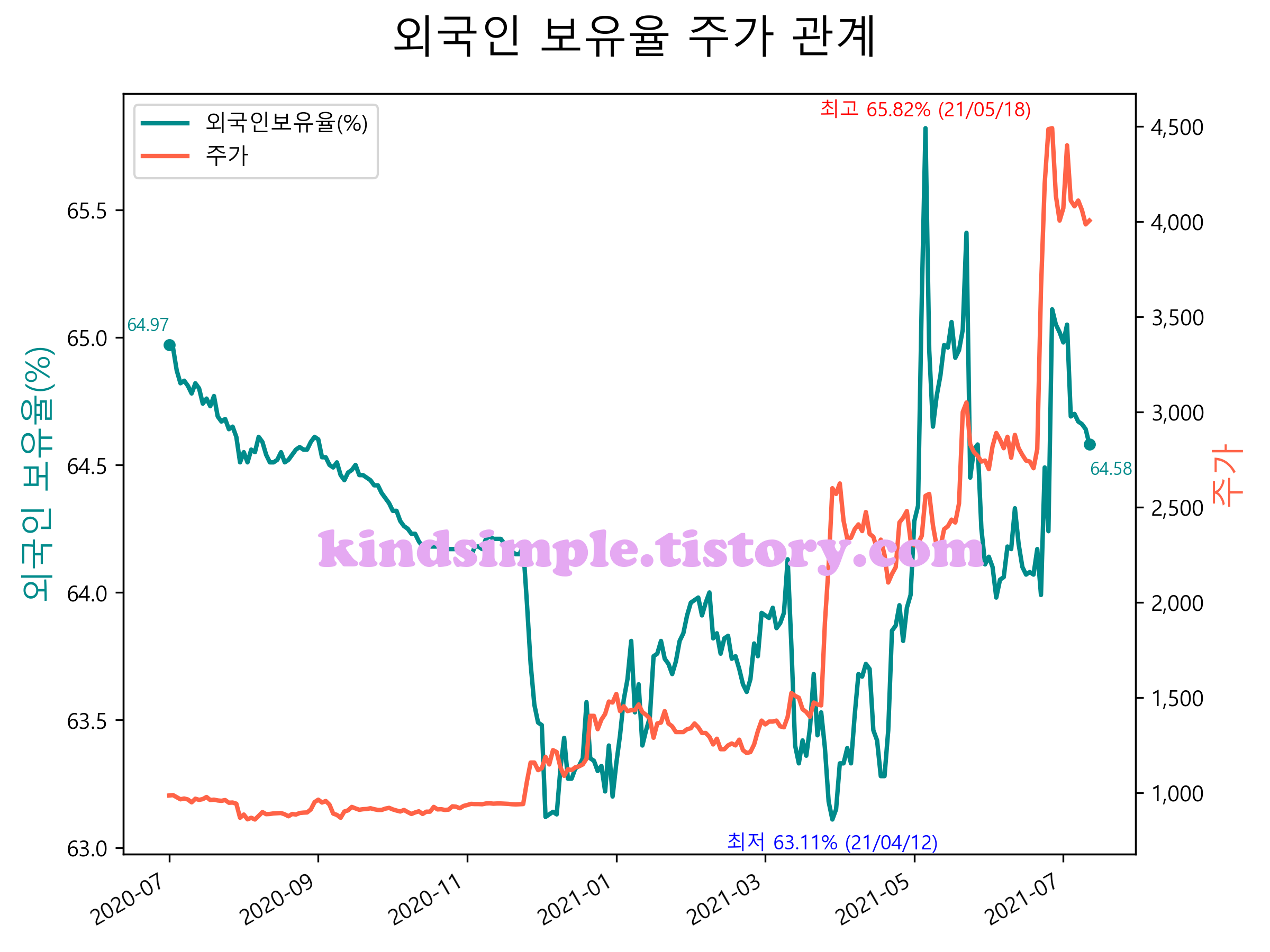 최근 1년간 외국인 보유율 및 주가와의 관계입니다.