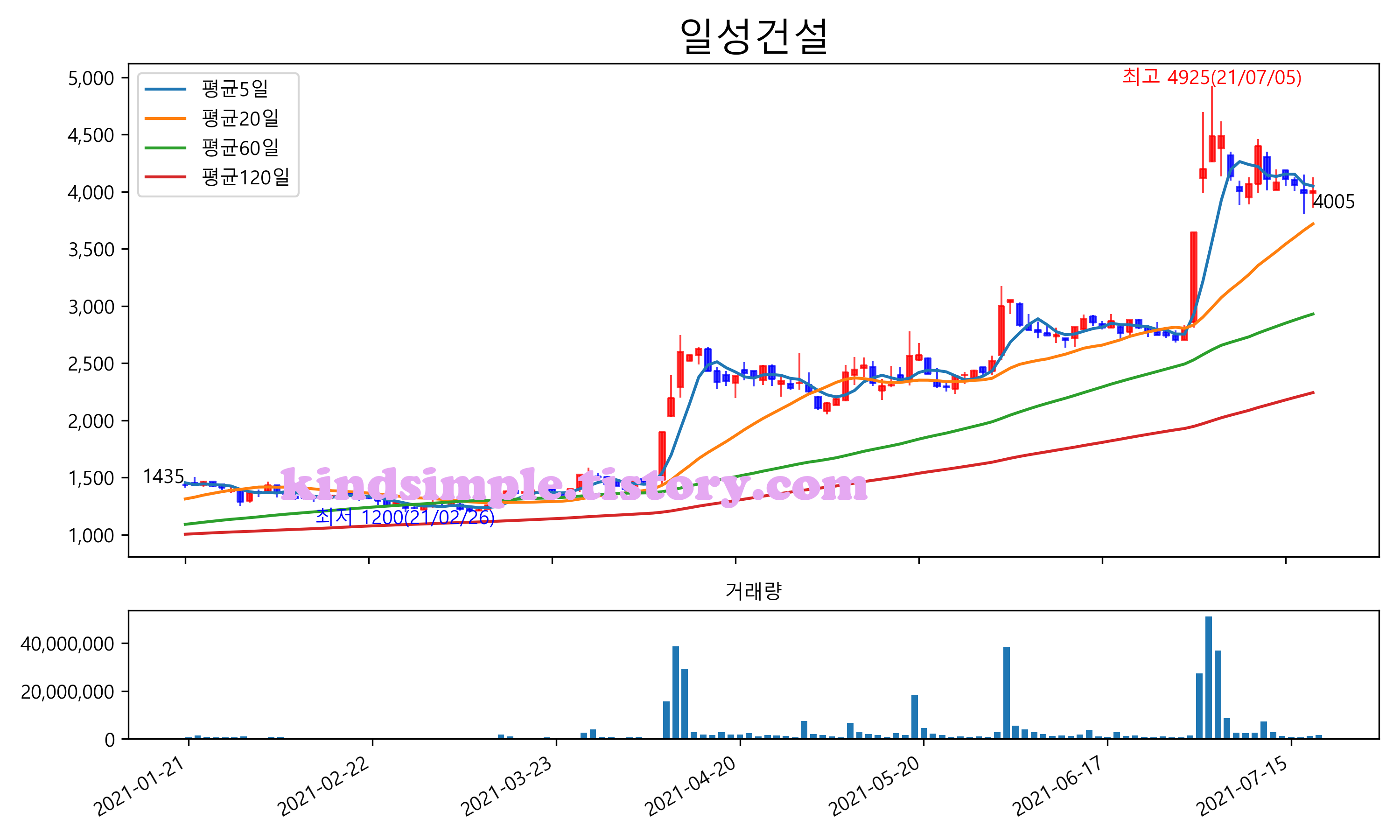 최근 6개월간 캔들차트 및 이동평균선입니다.