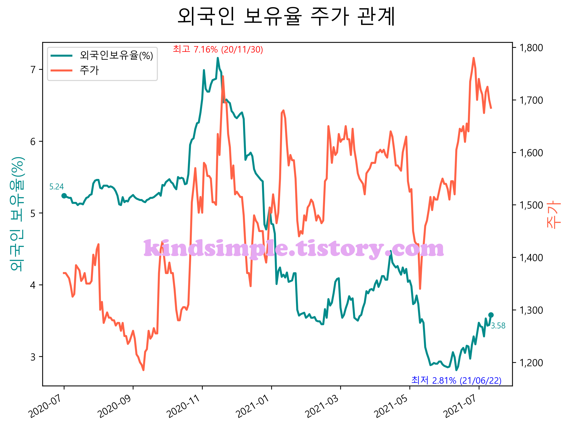최근 1년간 외국인 보유율 및 주가와의 관계입니다.