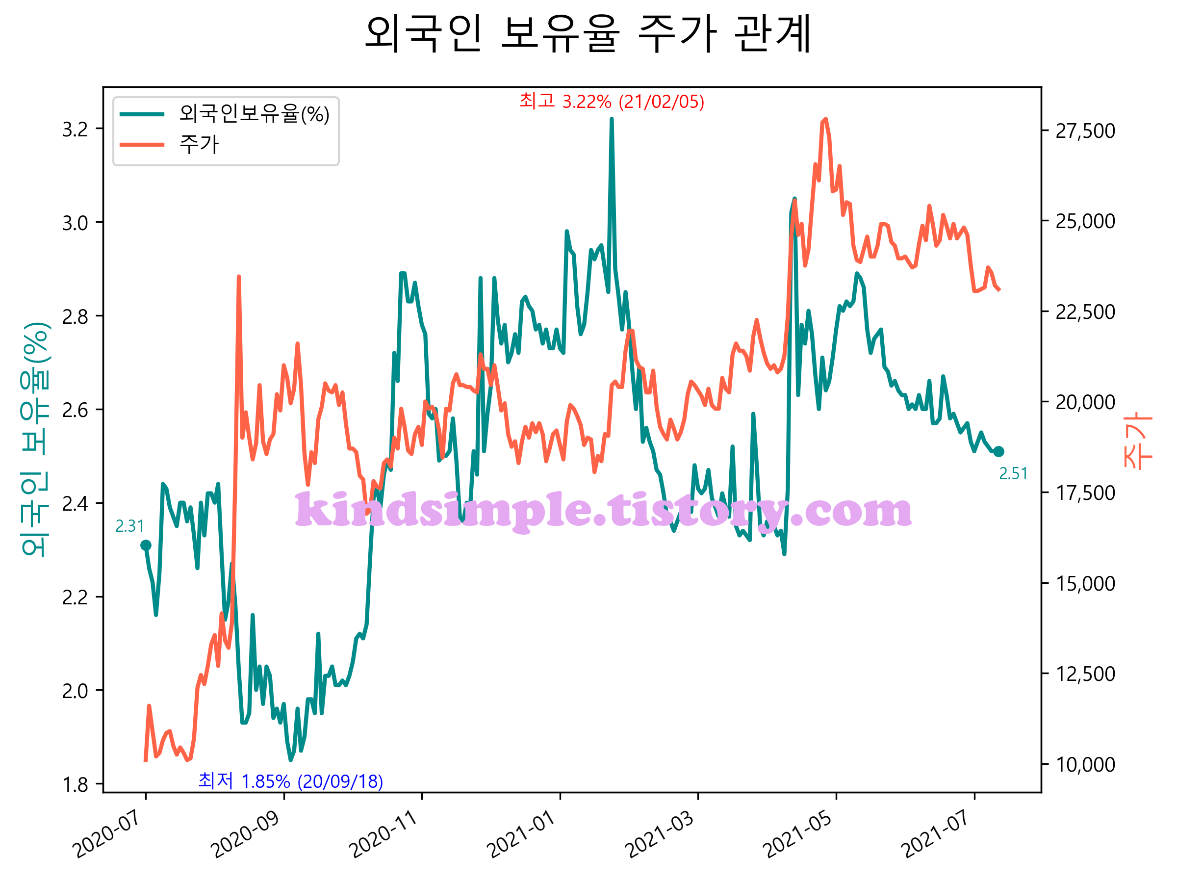 최근 1년간 외국인 보유율 및 주가와의 관계입니다.