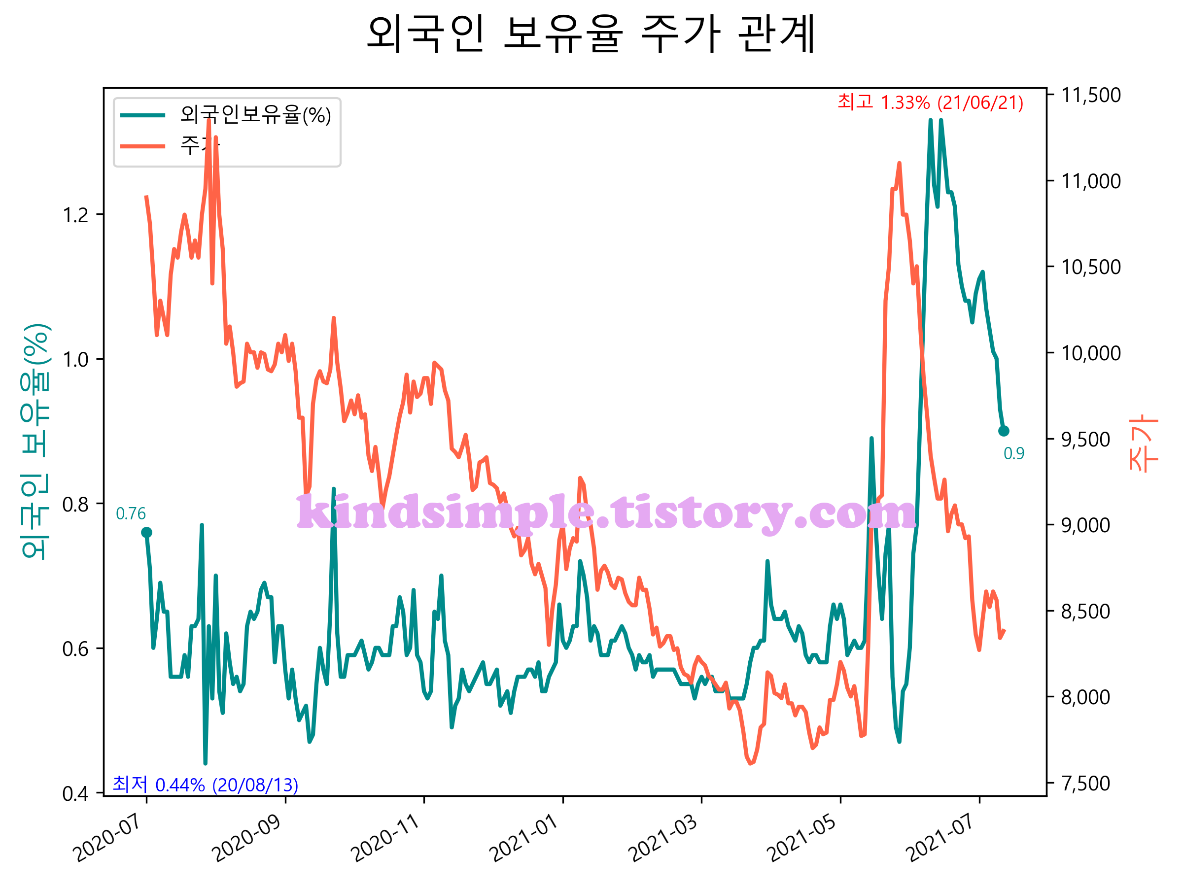 최근 1년간 외국인 보유율 및 주가와의 관계입니다.