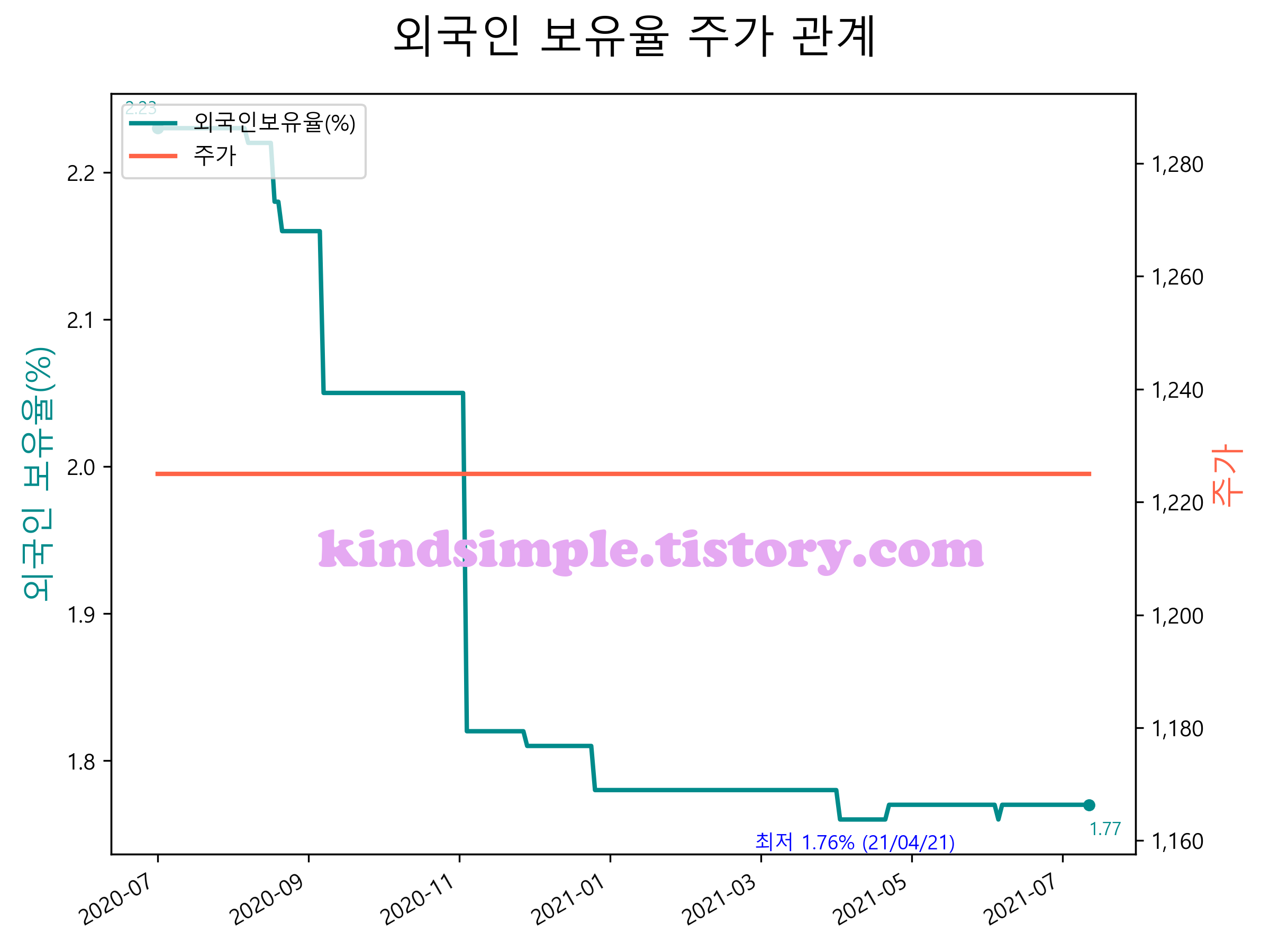 최근 1년간 외국인 보유율 및 주가와의 관계입니다.