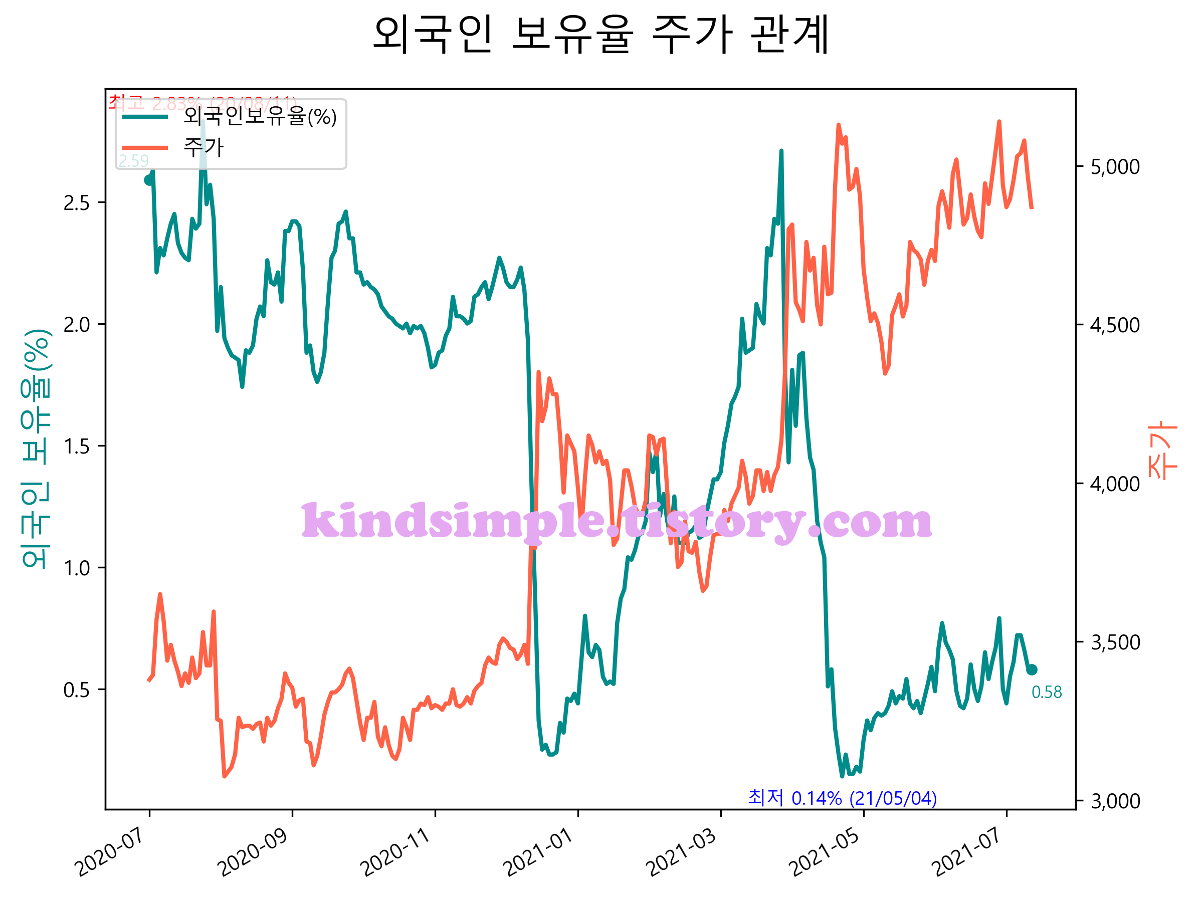 최근 1년간 외국인 보유율 및 주가와의 관계입니다.
