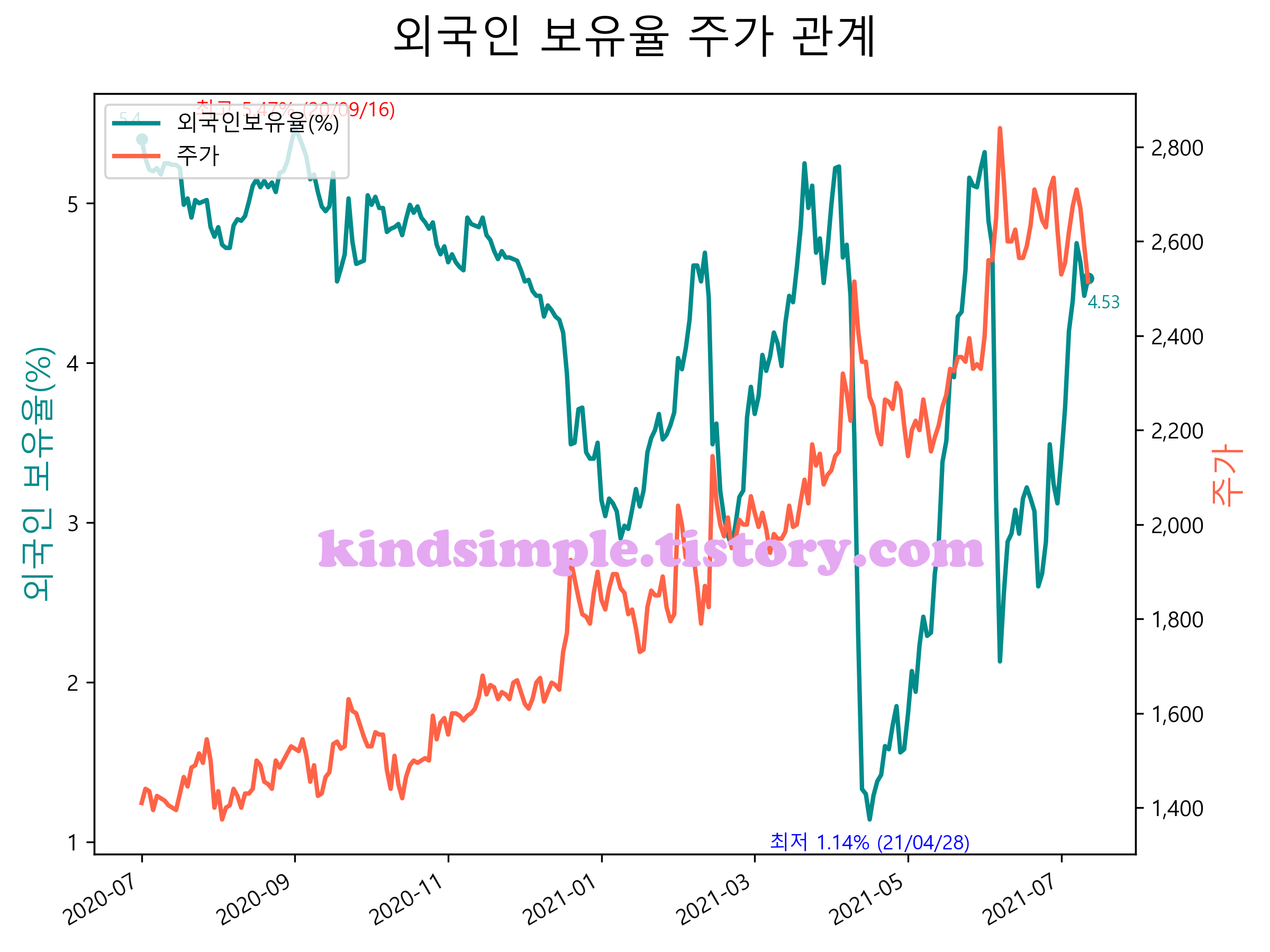 최근 1년간 외국인 보유율 및 주가와의 관계입니다.