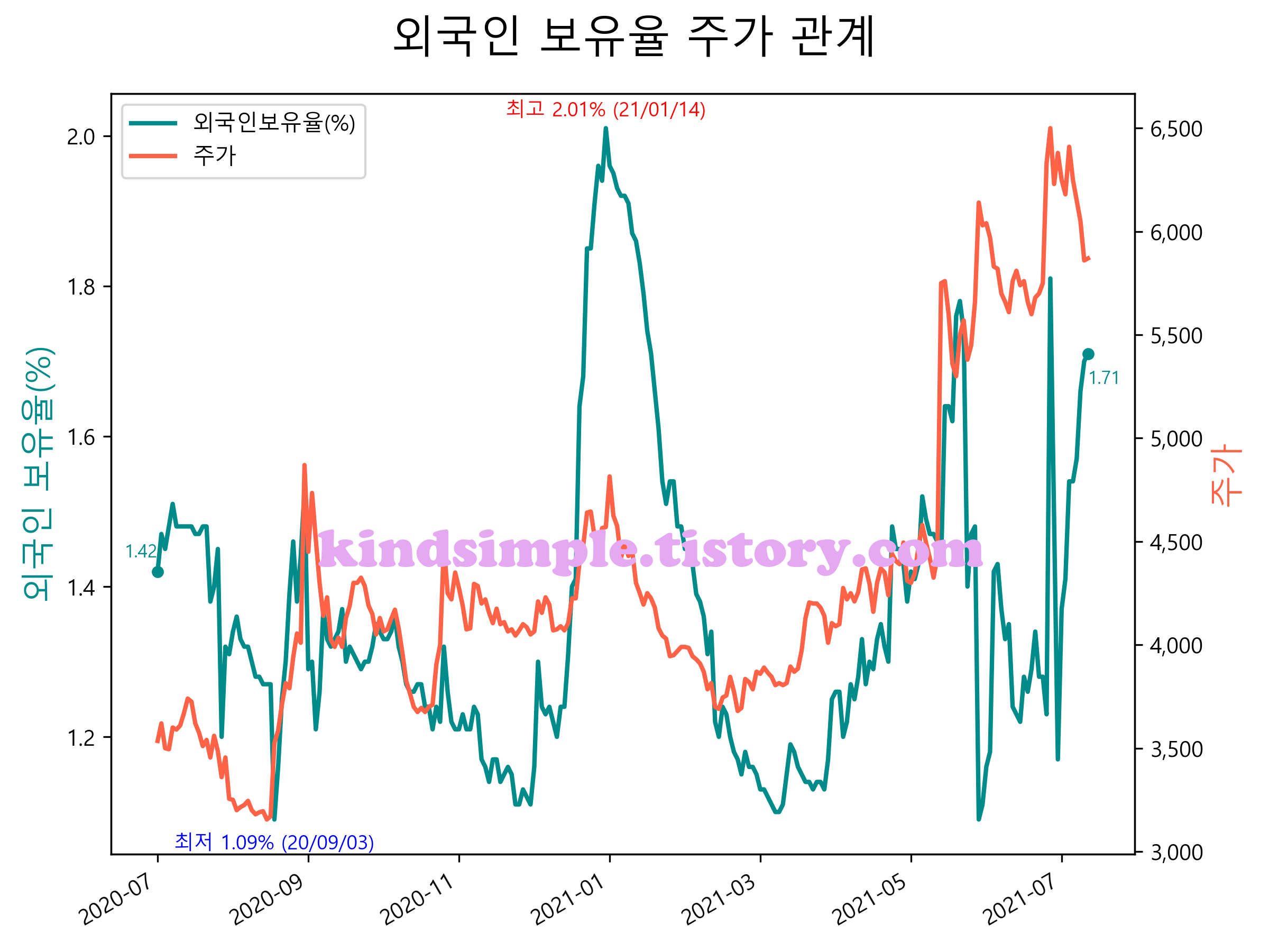 최근 1년간 외국인 보유율 및 주가와의 관계입니다.