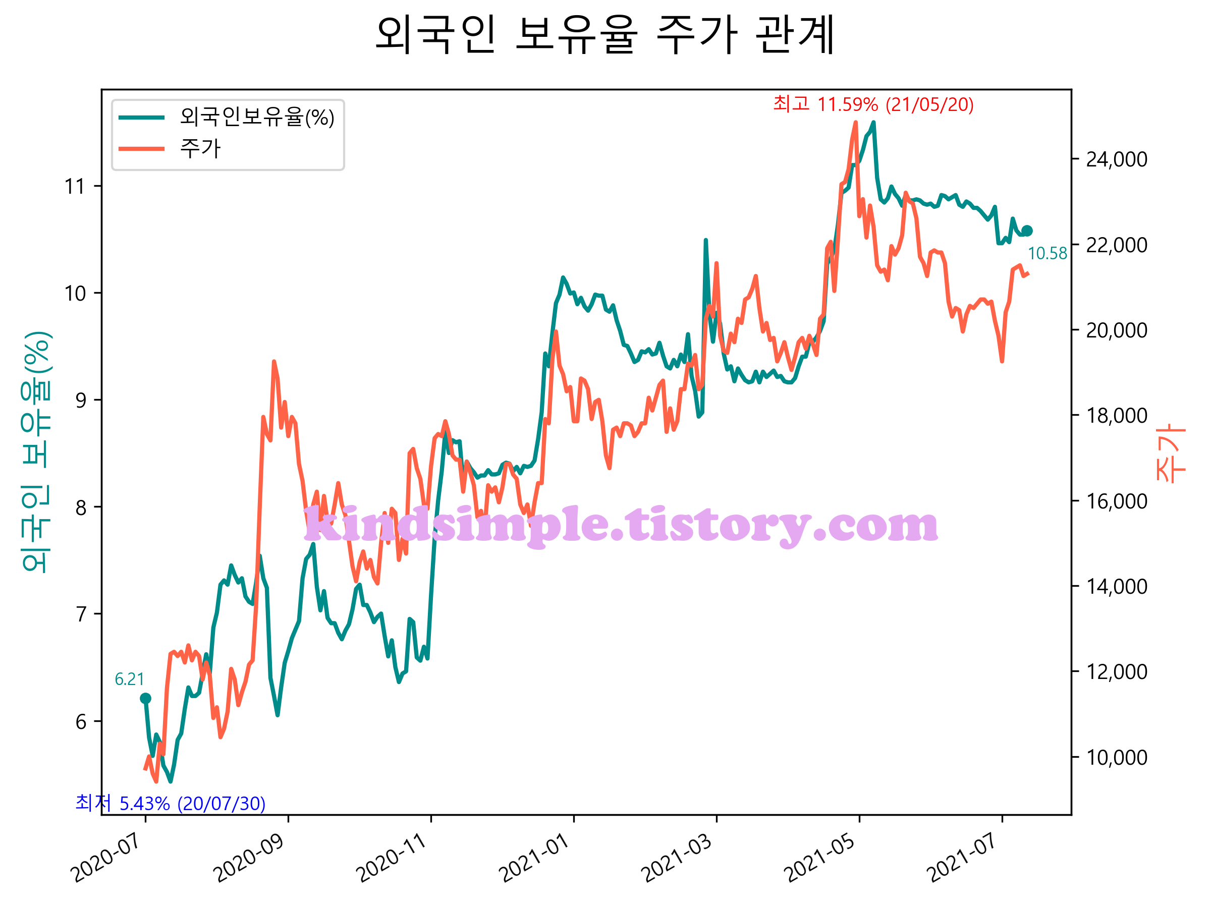 최근 1년간 외국인 보유율 및 주가와의 관계입니다.