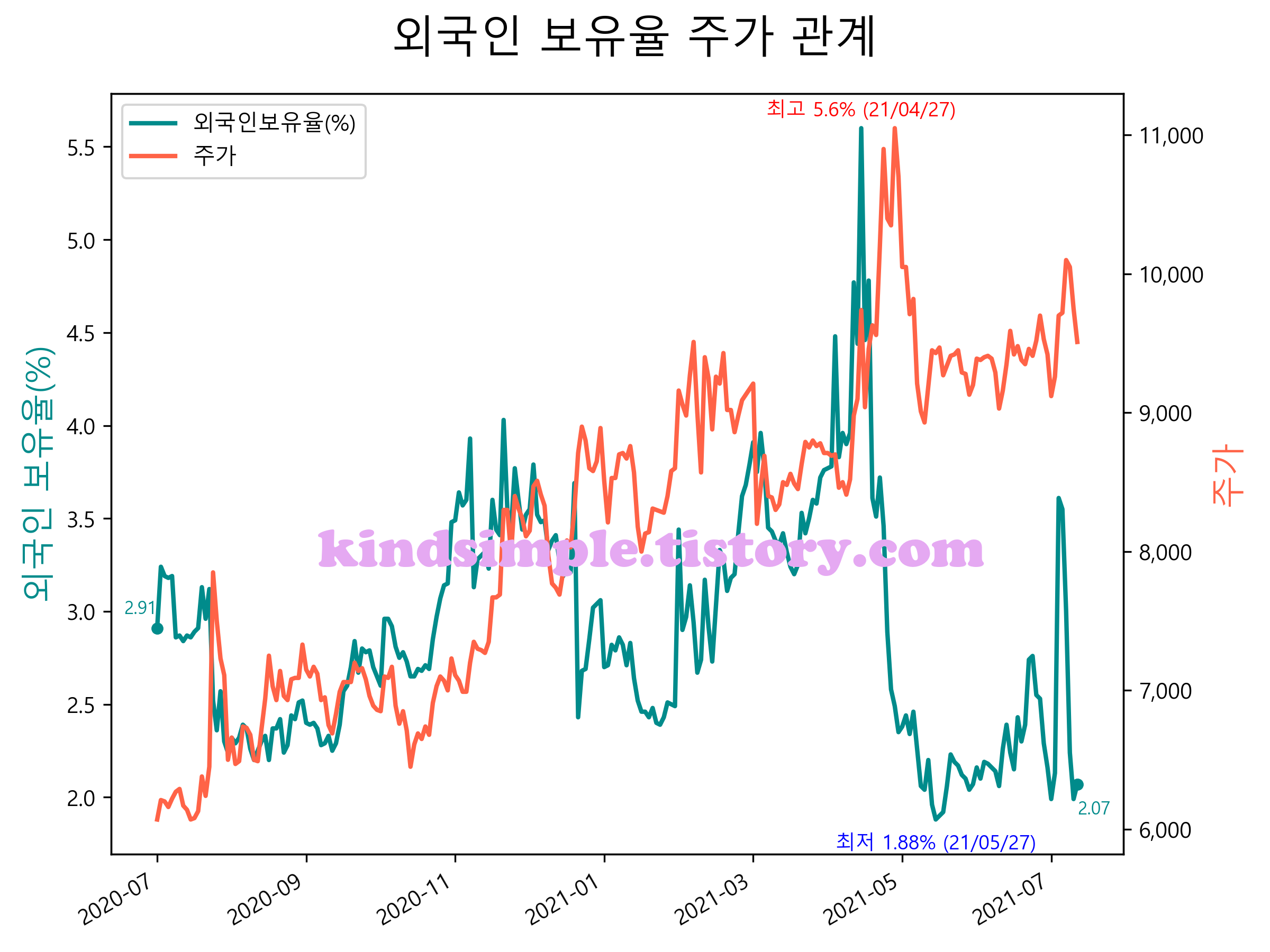 최근 1년간 외국인 보유율 및 주가와의 관계입니다.