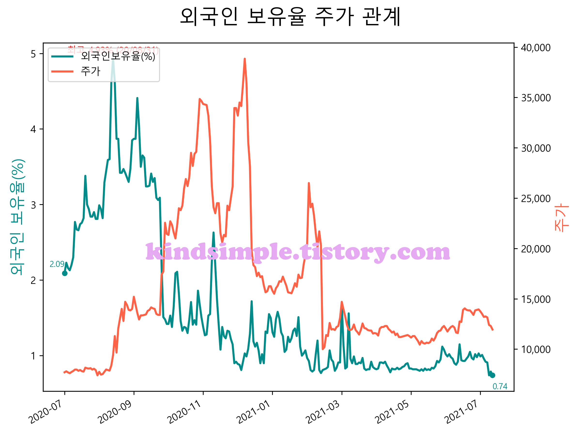 최근 1년간 외국인 보유율 및 주가와의 관계입니다.