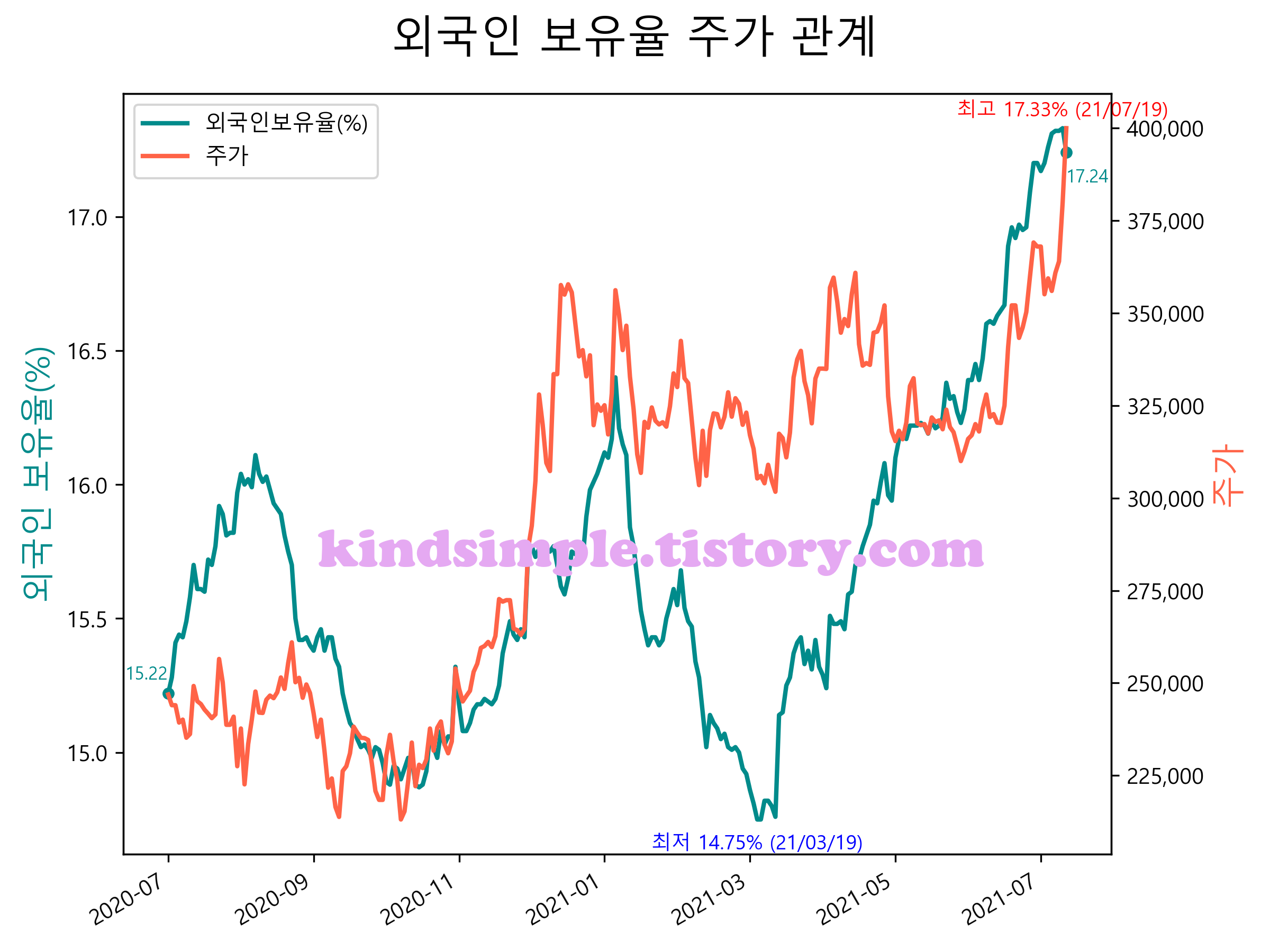 최근 1년간 외국인 보유율 및 주가와의 관계입니다.