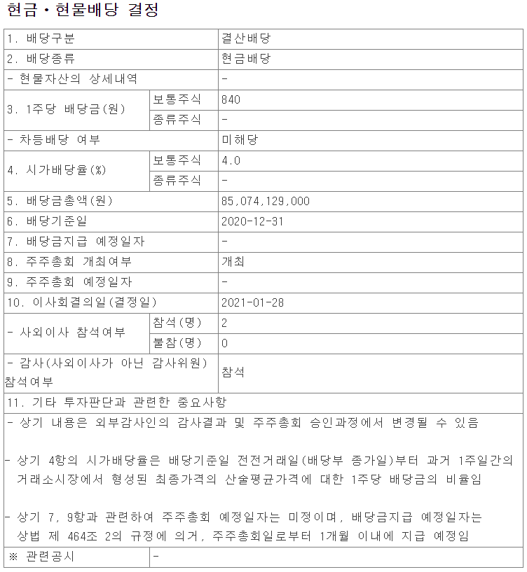 보통주는 840원이 배당되며, 시가배당율은 4.0% 입니다. 배당금 총액은 850억원 규모입니다.