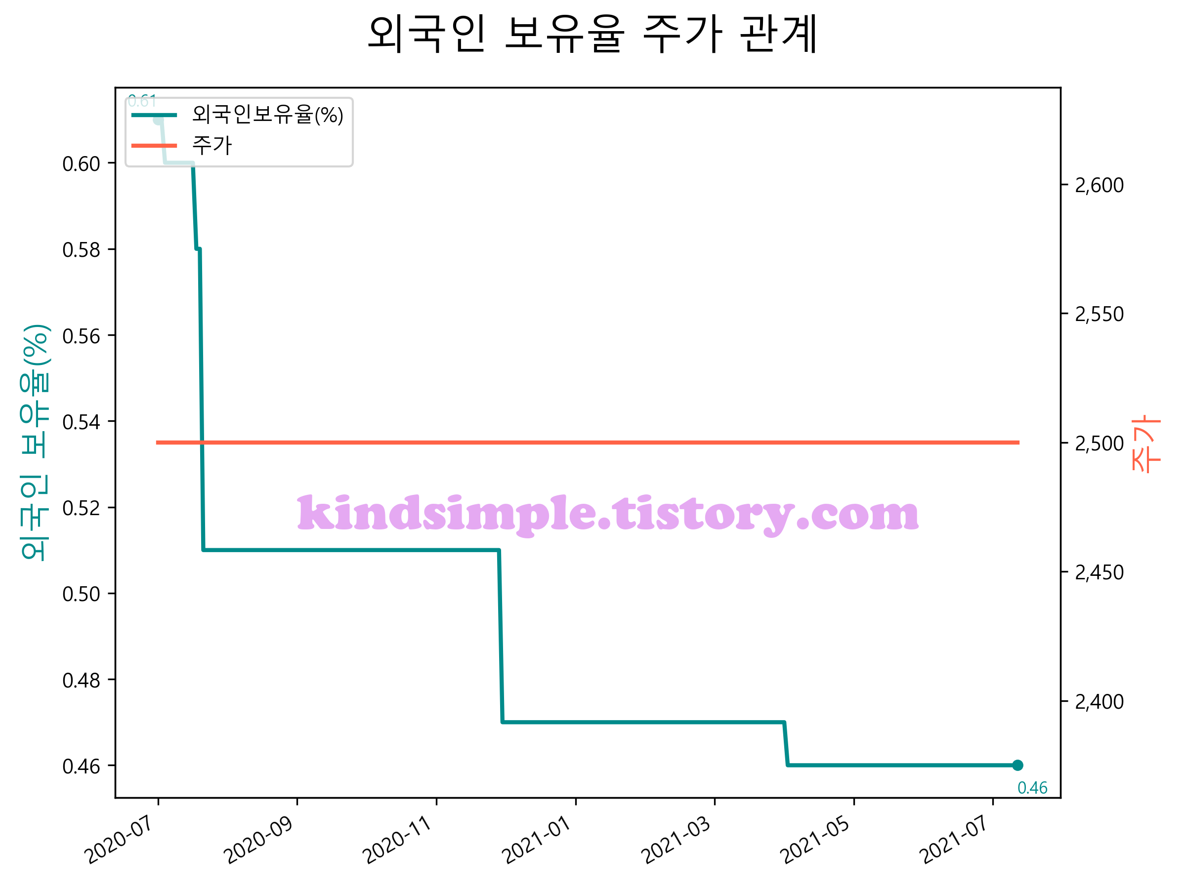 최근 1년간 외국인 보유율 및 주가와의 관계입니다.