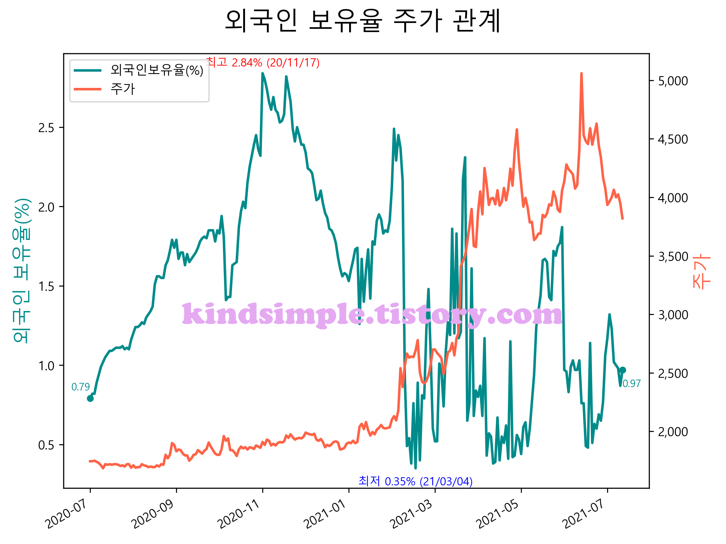 최근 1년간 외국인 보유율 및 주가와의 관계입니다.