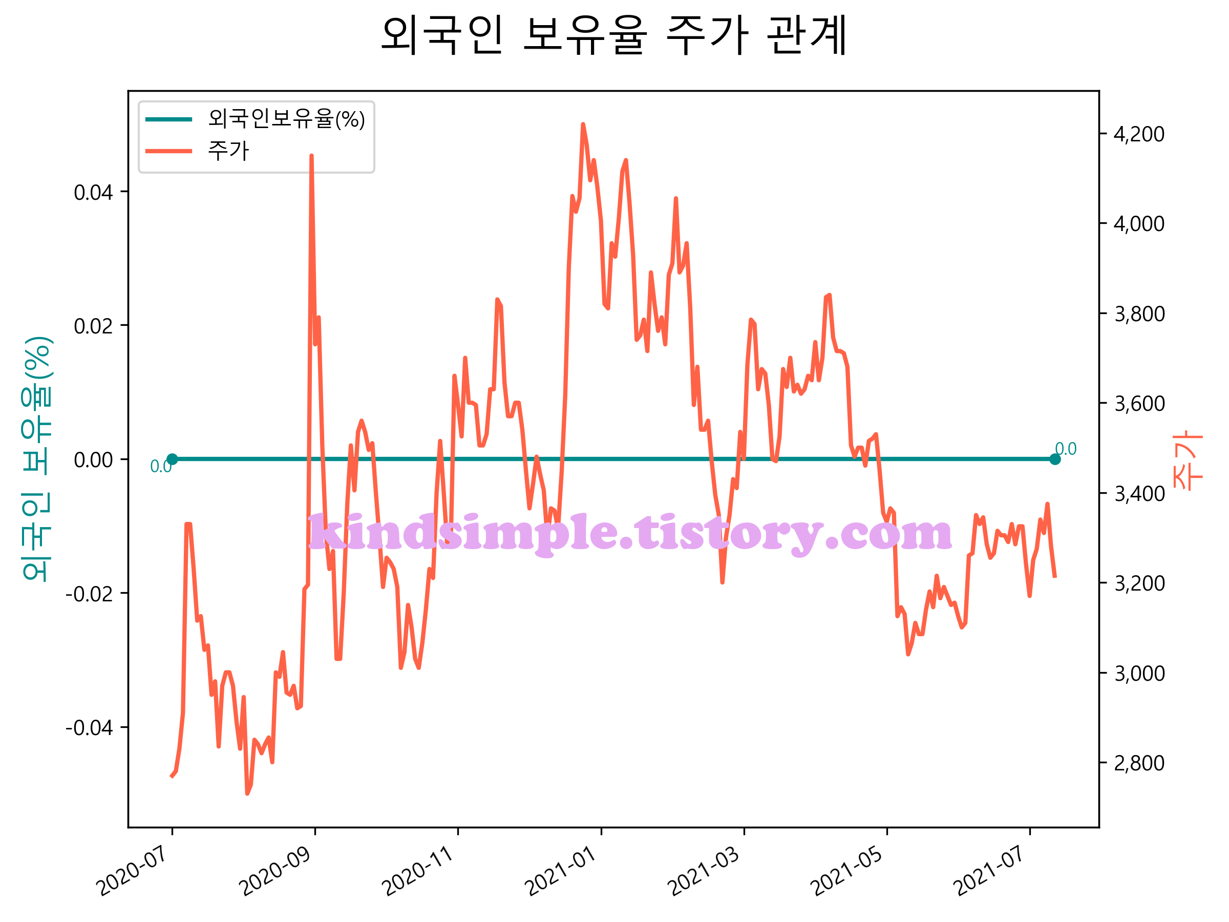 최근 1년간 외국인 보유율 및 주가와의 관계입니다.