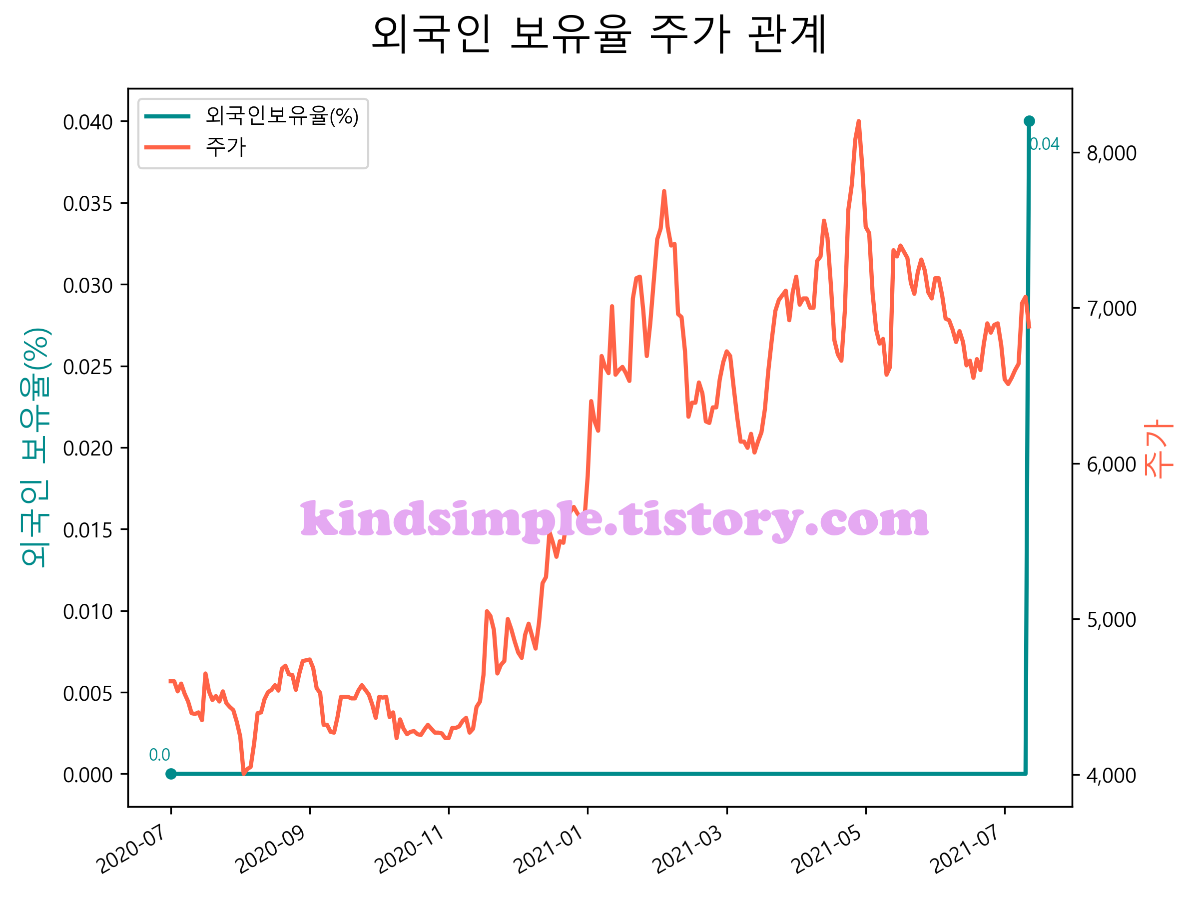 최근 1년간 외국인 보유율 및 주가와의 관계입니다.