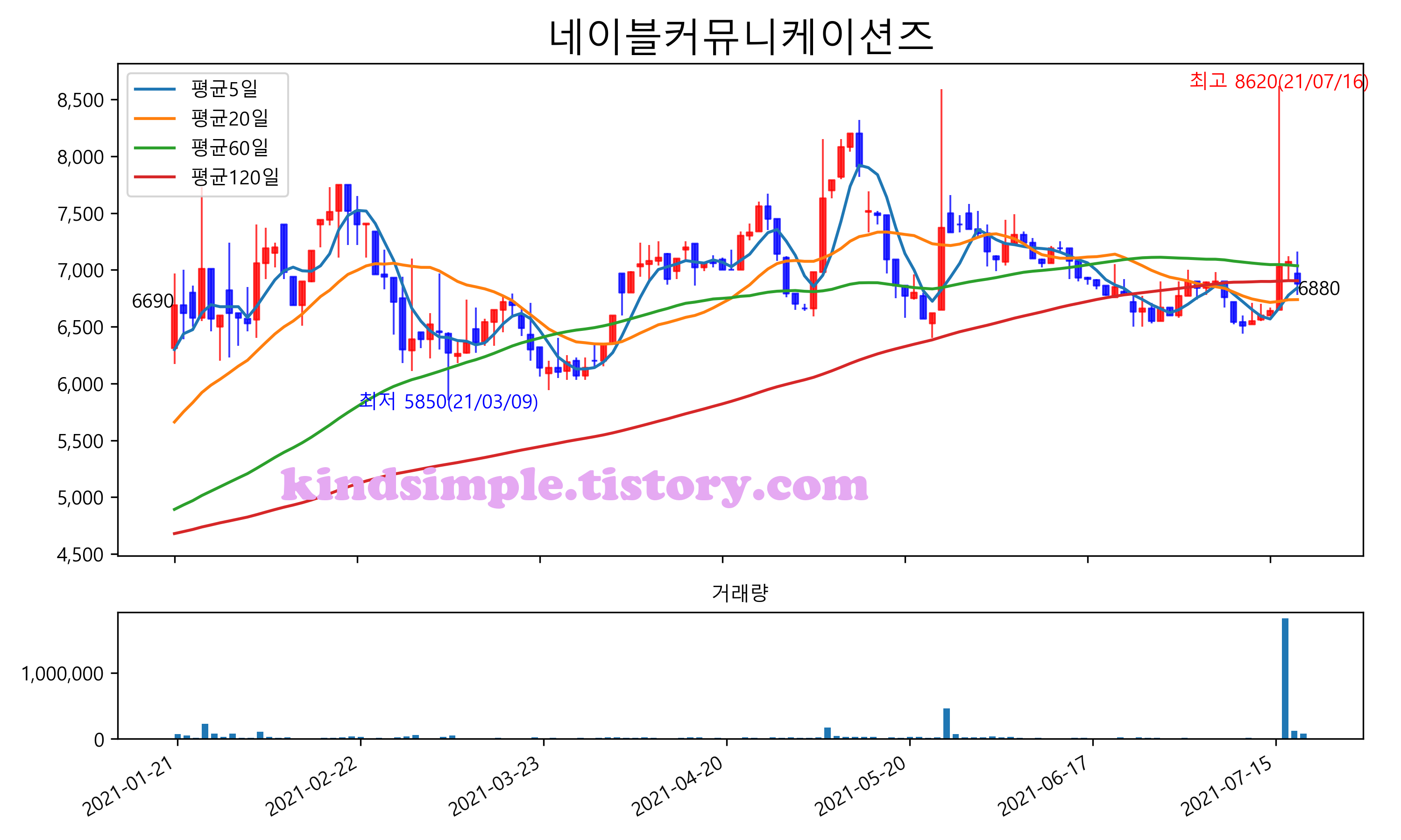 최근 6개월간 캔들차트 및 이동평균선입니다.