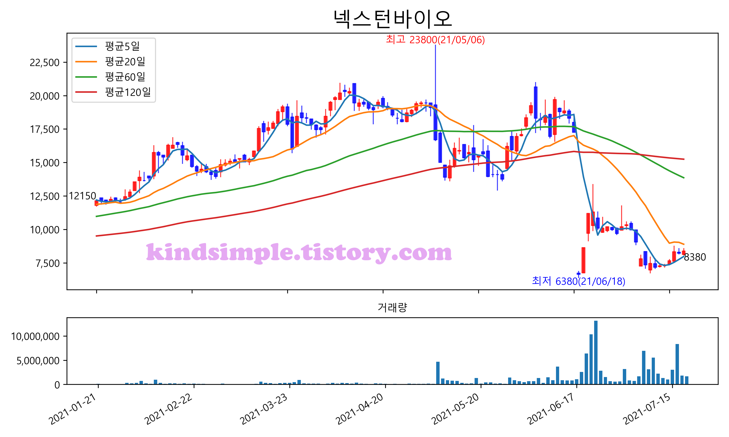 최근 6개월간 캔들차트 및 이동평균선입니다.